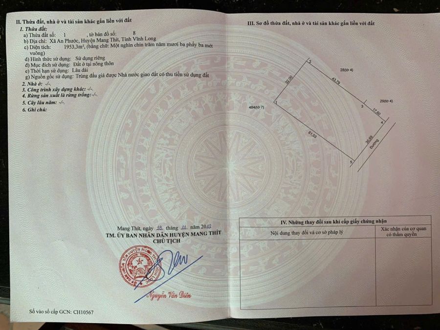 CẦN BÁN GẤP 1953.3m² ĐẤT, 100% THỔ CƯ Mặt Tiền Tỉnh Lộ 902, Xã An Phước, H. Mang Thít, Vĩnh Long