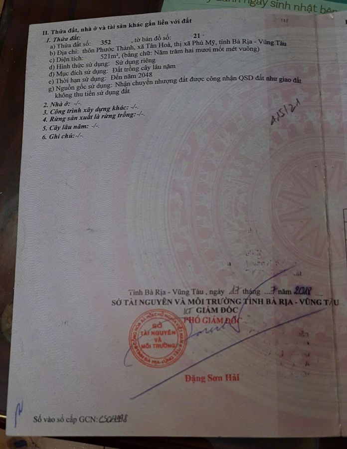- Tổng Diện tích: 521m2, Trong đó 521m đất trồng cây lâu năm (bên cạnh đã chuyển lên thổ cư), cách suối 50m. Quy hoạch: 521m đất ở đô thị - Mặt đường đất 7 chỗ quay đầu.