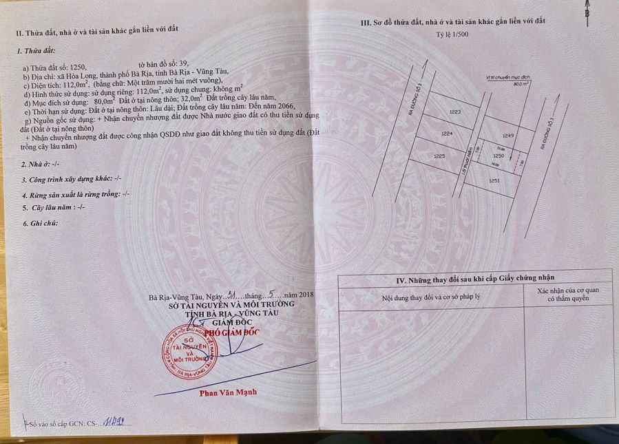 Cần bán lô đất mặt tiền đường nhựa xã Hòa Long, TP Bà Rịa.