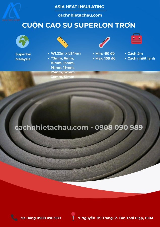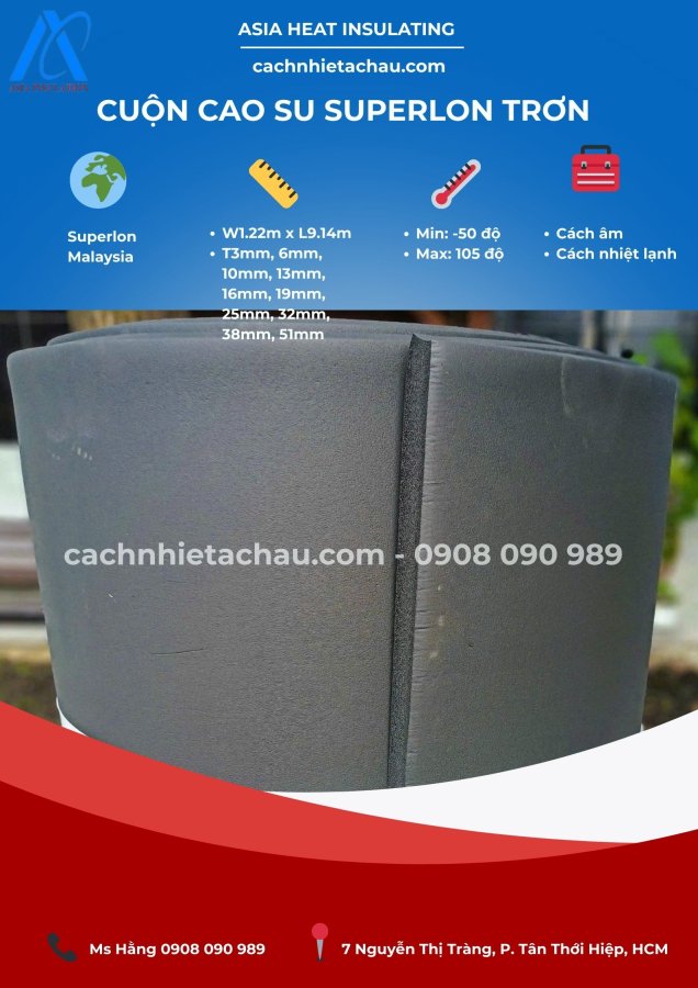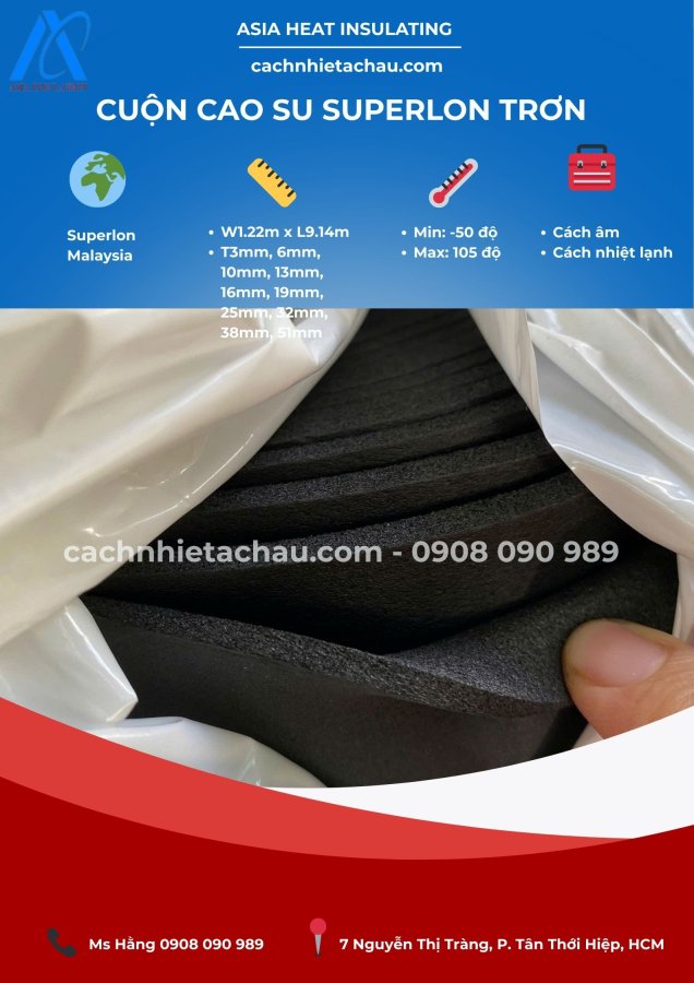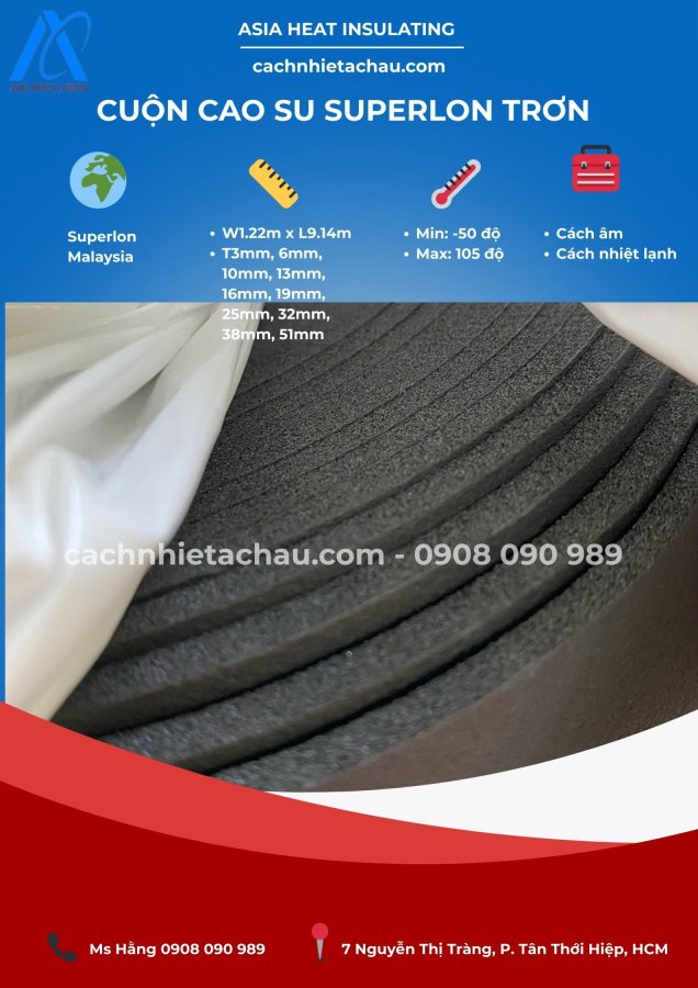 Cao su lưu hóa/ gen cách nhiệt Superlon Malaysia là sản phẩm cách nhiệt dạng cuộn không có chất CFC, HCFC và O.D.P. được chế tạo từ chất dẻo nhẹ có tính đàn hồi cao sử dụng cho lĩnh vực cách nhiệt