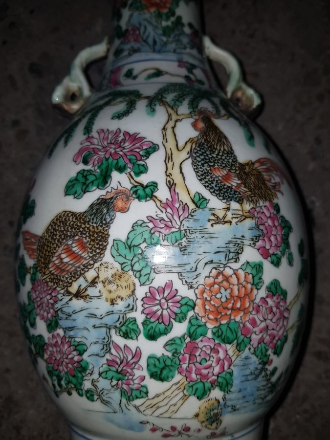 Cặp bình xưa đăng đối vẽ Cúc Kê với dáng hiếm thấy , có phần miệng đấu và song nhĩ là 2 cây gậy như ý 2 bên với ý nghĩa Cát Tường Viên Mãn. Cặp bình cao tổng thể 31.5cm.miệng 12cm. vòng bụng 47.5cm. lành lặn. GL5.550k