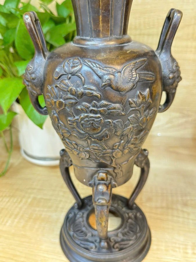 🌳 Chất liệu : đồng đúc nguyên bản . Bình có quai cầm độc đáo , họa tiết hoa lá và chim xinh xắn xung quanh thân bình. Đế 3 chân vững chắc. Cổ bình có kiểu dáng khía rãnh cách điệu tuyệt đẹp