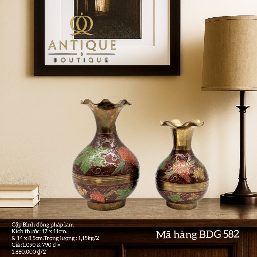 Cặp Bình đồng pháp lam. Kích thước: 17 x 11cm & 14 x 8,5cm.Trọng lượng : 1,15kg/2. Giá :1.090 & 790 đ =