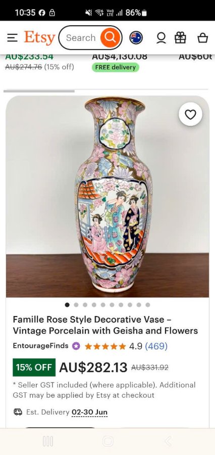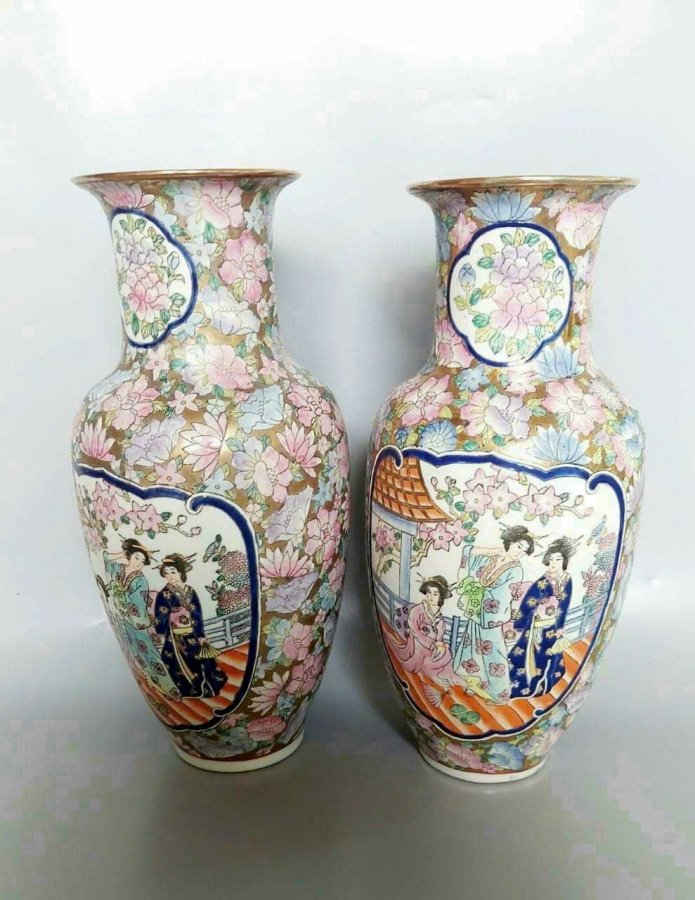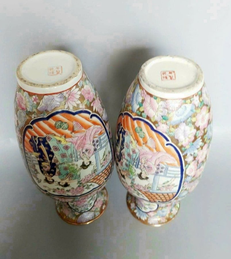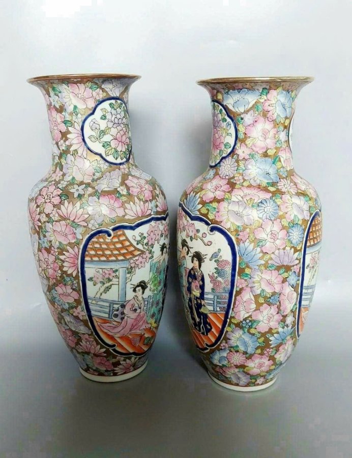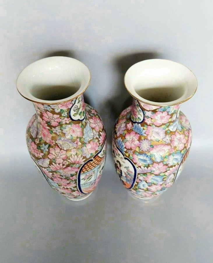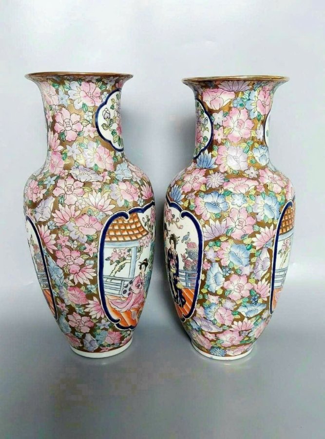 Cặp bình gấm màu vẻ tay xuất dương xưa.Cao 41cm*đkm 13,8cm*vb 61,5cm.Triện 乾隆年制Càn Long Niên Chế.