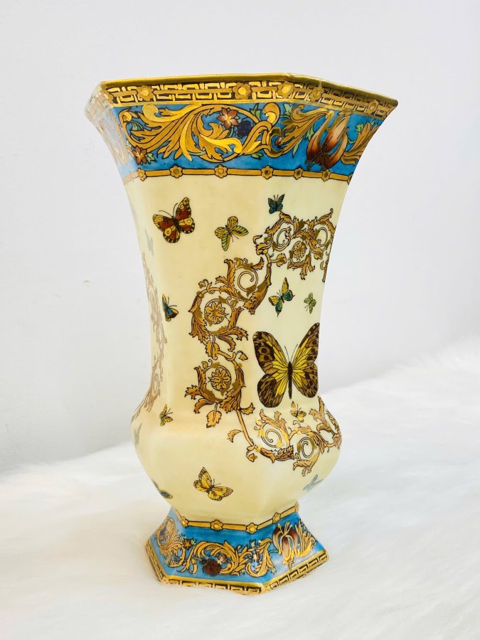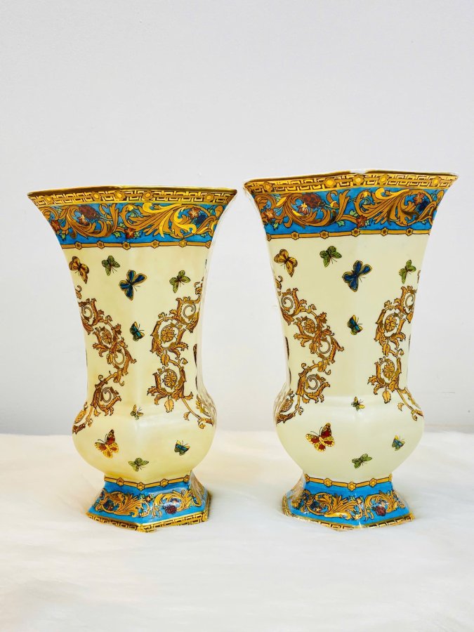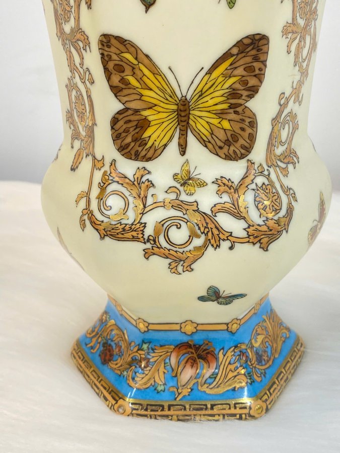 Cặp bình gốm sứ Meissen cổ dáng lục giác họa tiết bướm vẽ vàng lành tít