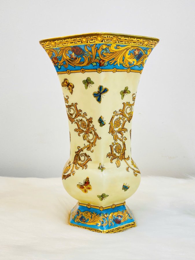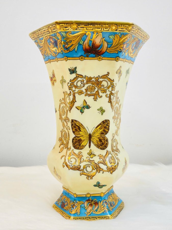 - Hoạ tiết bướm nhiều màu sắc phối hoa văn vẽ vàng trên nền men ngà rất đẹp