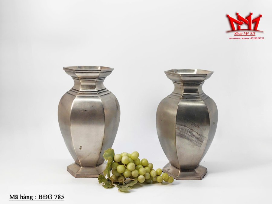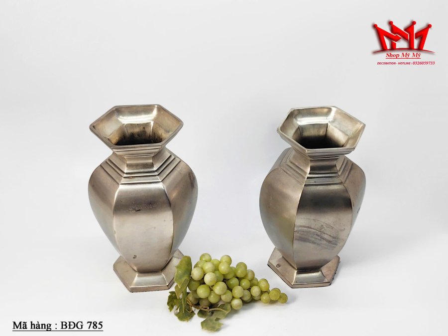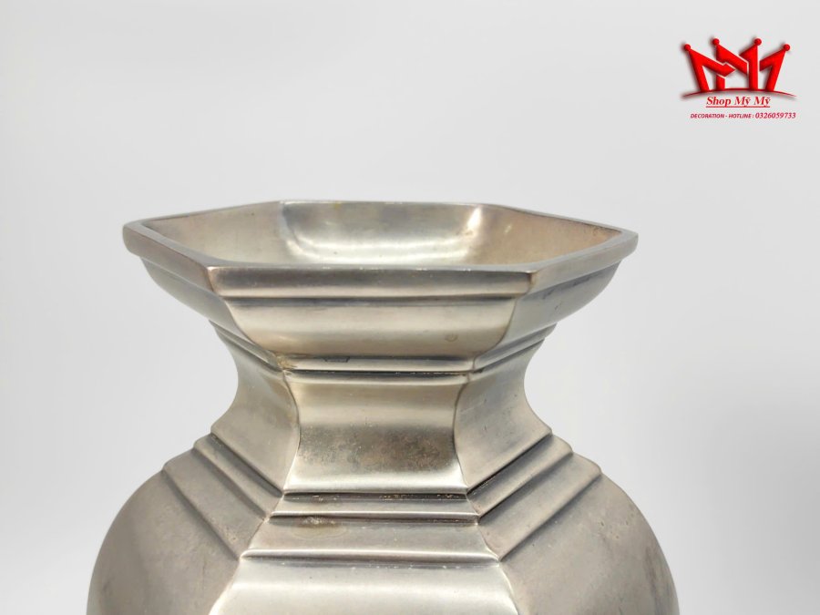 Cặp bình hoa kim loại lục giác cổ điển, được xác định là sản phẩm thuộc bộ sưu tập bình bạc cổ của thương hiệu Pottery Barn.