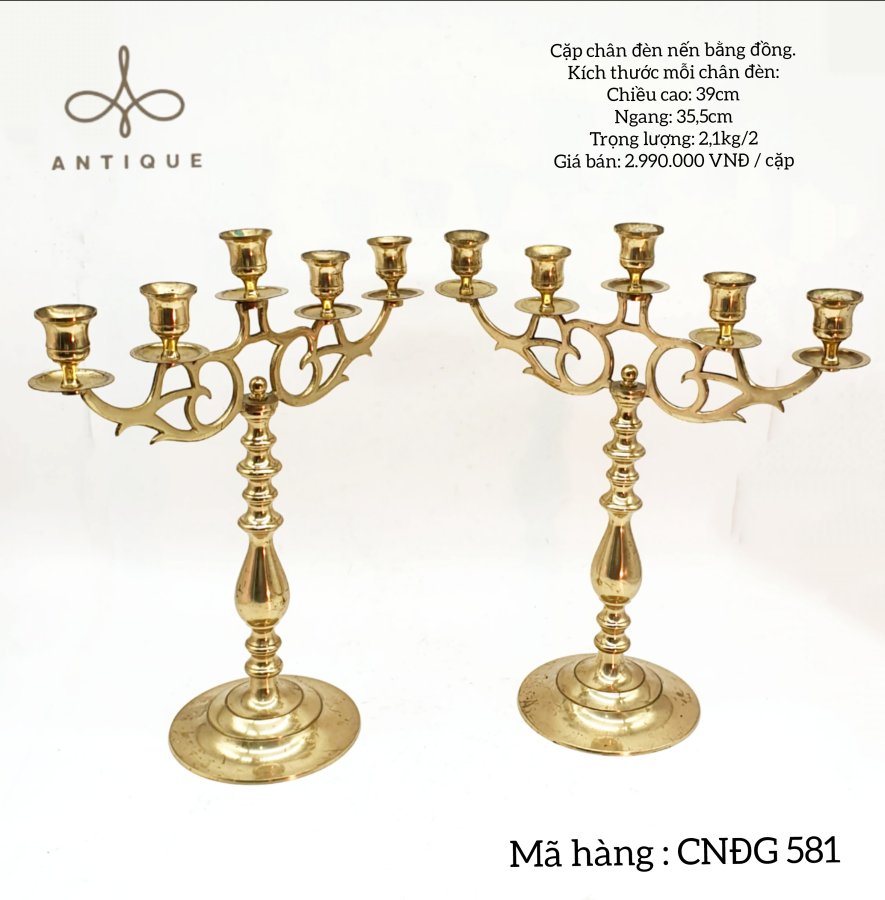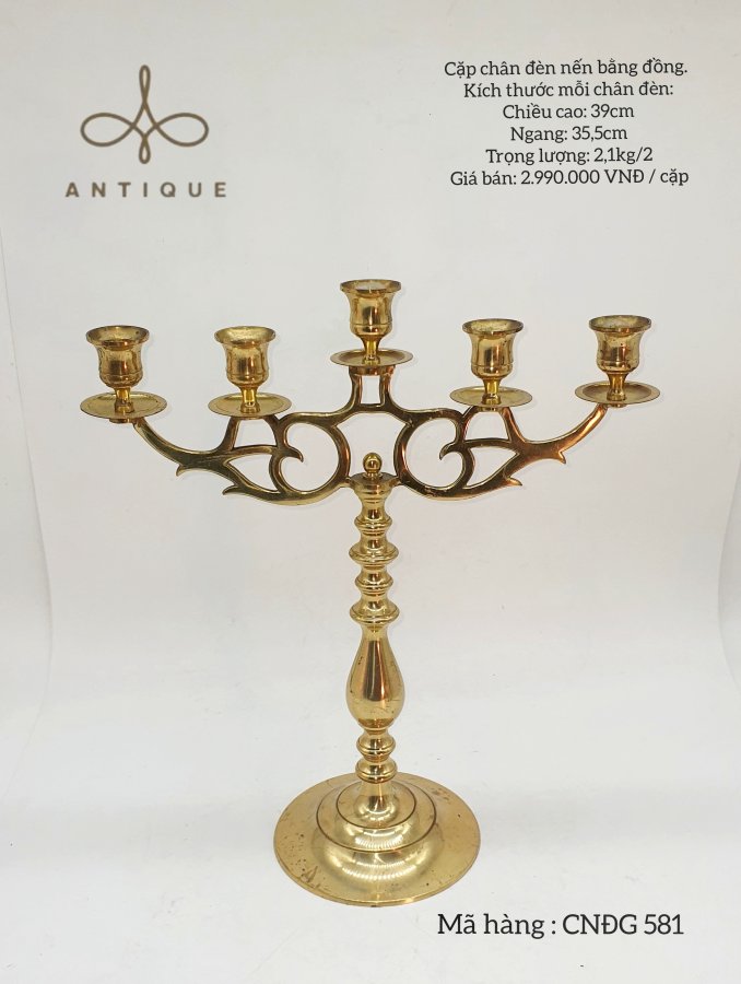 Cặp chân đèn nến bằng đồng.Kích thước mỗi chân đèn: Chiều cao: 39cm. Ngang: 35,5cm.Trọng lượng: 2,1kg/2. Giá bán: 2.990.000 VNĐ / cặp. Mã hàng : CNĐG 581