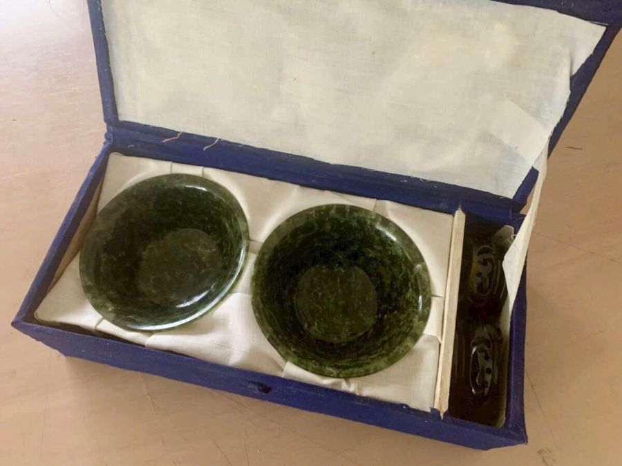 Cặp chén ngọc thiên nhiên rất đẹp , lành tít full hộp và đế gỗ