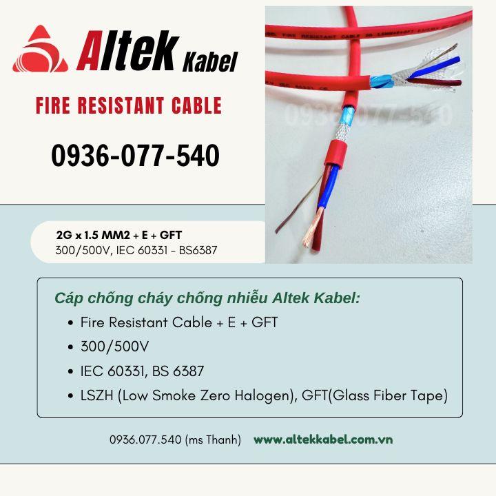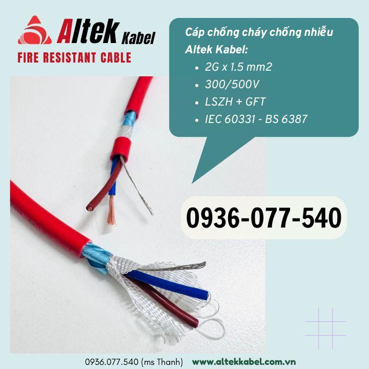 Cáp chống cháy chống nhiễu Altek Kabel là một loại cáp điện chuyên dụng được sản xuất bởi thương hiệu Altek Kabel. Cáp chống cháy này được thiết kế đặc biệt để duy trì hoạt động của mạch điện trong trường hợp xảy ra hỏa hoạn, đáp ứng các tiêu chuẩn an toàn cháy nổ quốc tế: IEC 60331, BS 6387 (có kiểm định Quatest 1)