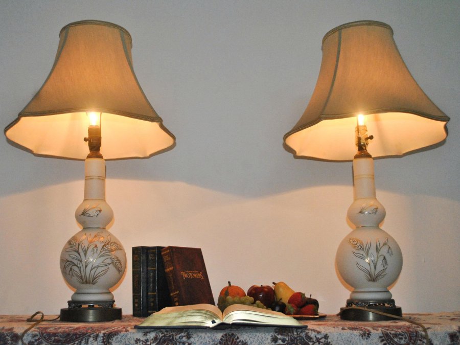 Tô điểm không gian sống bằng nét thanh lịch và tinh tế của cặp đèn bàn thủy tinh nhập khẩu từ Mỹ. Thân đèn được chế tác từ thủy tinh trắng đục, trang trí họa tiết hoa lá mạ vàng tinh xảo, mang đậm phong cách cổ điển. Chụp đèn vải xếp ly tông kem sang trọng, ánh sáng dịu nhẹ, phù hợp cho phòng khách, phòng ngủ hoặc không gian đọc sách.