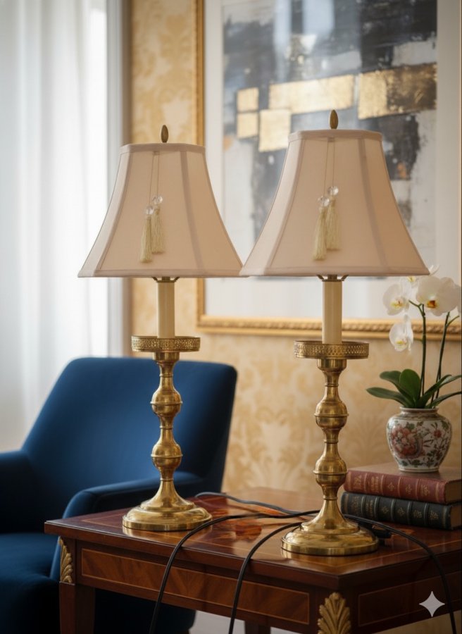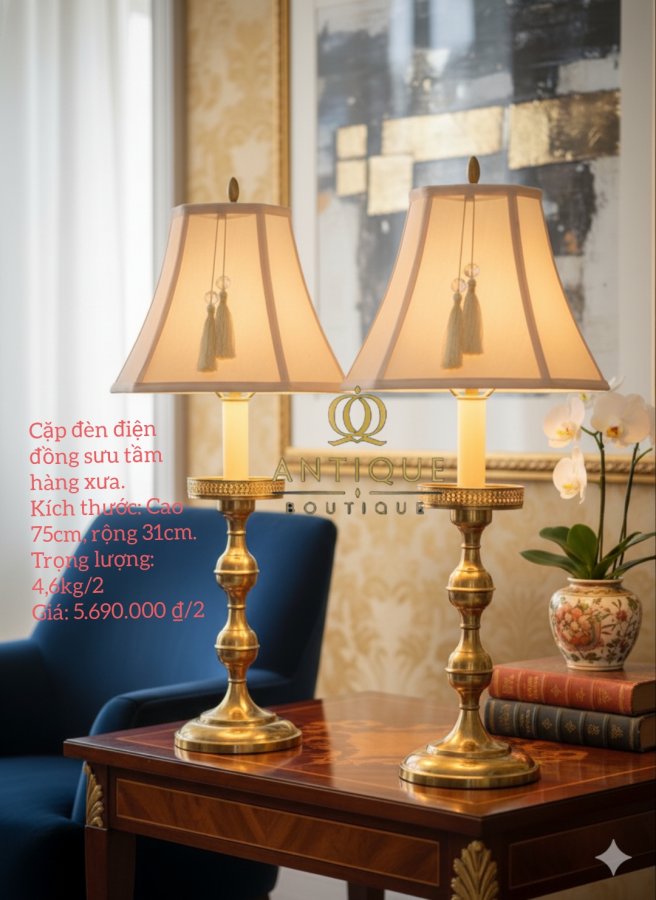 Cặp đèn đồng sưu tầm xưa, hàng. Kích thước: Cao 75cm, rộng 31cm.Trọng lượng: 4,6kg/2