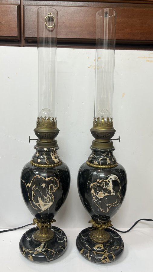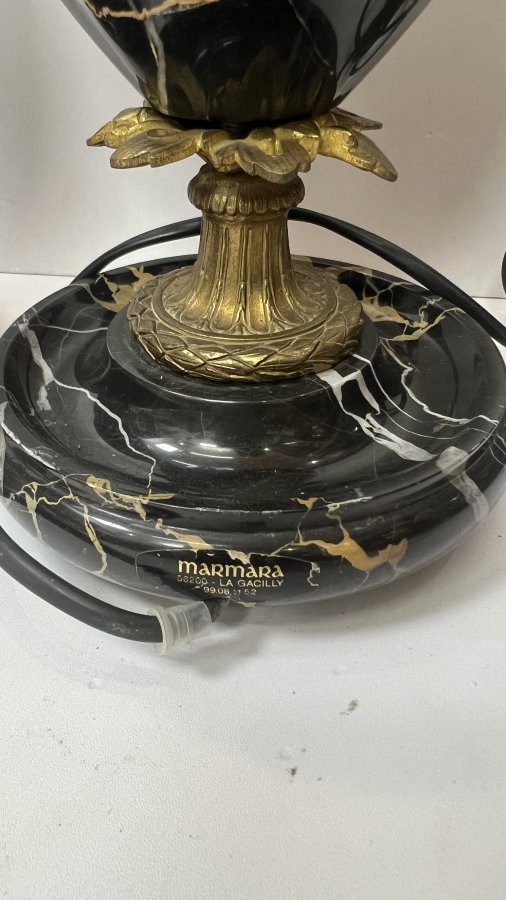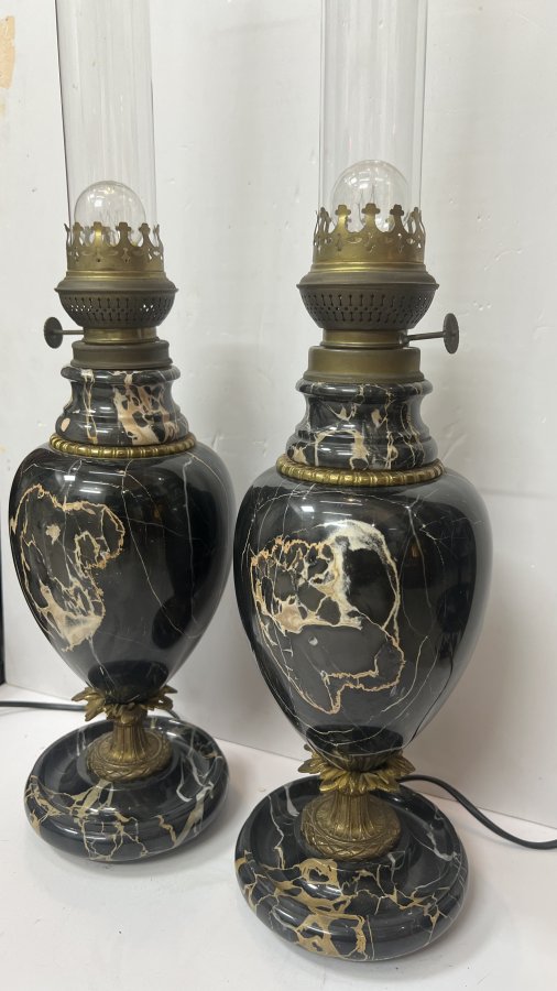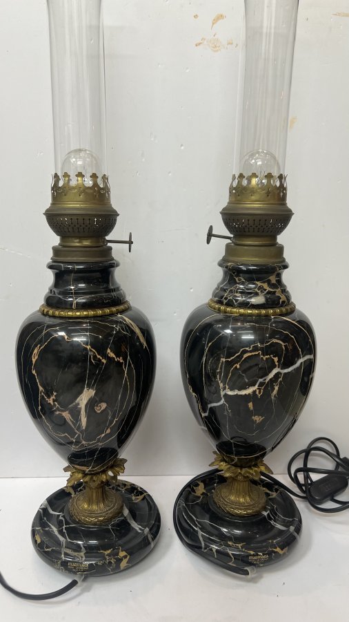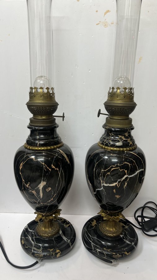 Cặp Đèn Marmara Pháp xưa đồng và đá cẩm thạch đen vân tự nhiên tuyệt đẹp