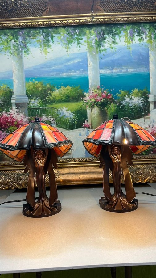 Cặp đèn tifany thiếu nữ cầm đèn,hợp kim mạ đồng hun rất nặng,chuẩn hàng nhập Mỹ xưa rất đẹp và độc đáo thị trường rất ít đáng được sưu tầm