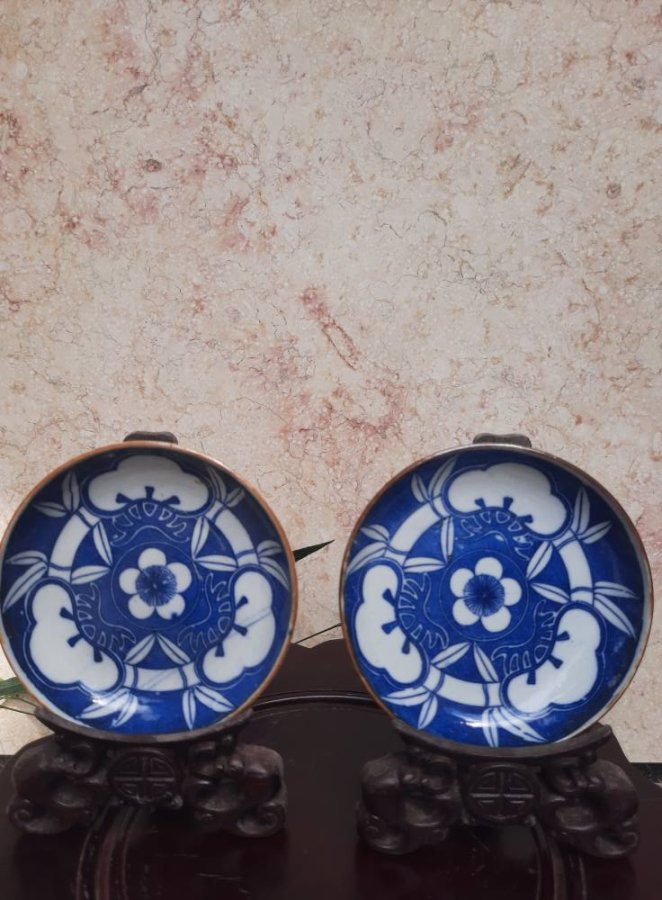 Cặp đĩa gốm sứ xanh trắng xưa họa tiết vẽ Hoa
