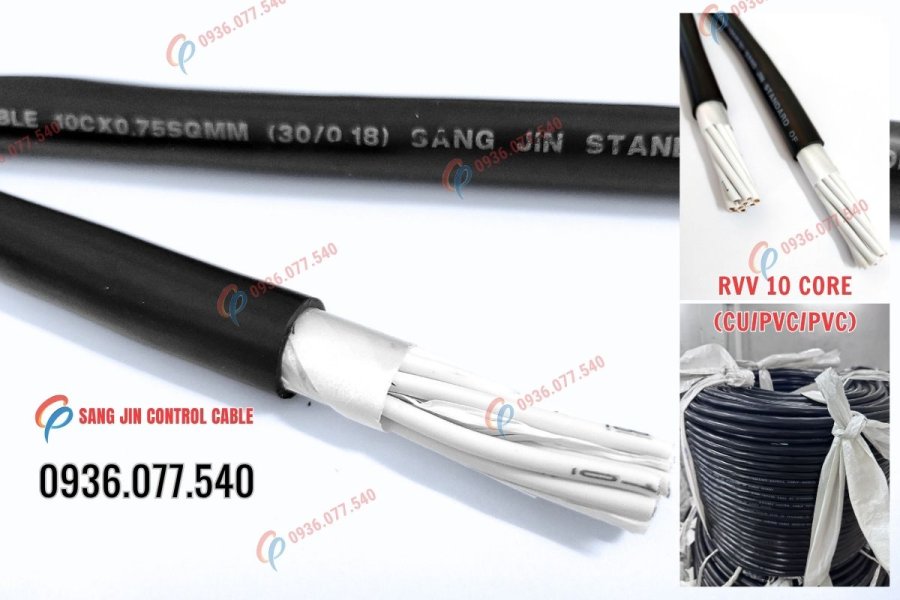 Cáp điều khiển Sangjin 10C x 0.75mm² – RVV là dòng cáp điều khiển không chống nhiễu, thích hợp cho hệ thống điều khiển, tín hiệu và tủ điện công nghiệp.