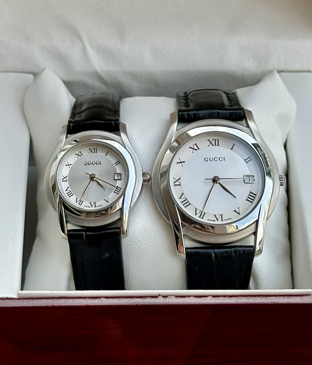 Cặp Đồng hồ Gucci 5500M vs 5500L chính hãng Thuỵ Sỹ cực đẹp. Sử dụng máy quartz Thuỵ Sỹ Gucci cao cấp nguyên zin chạy chuẩn. Vỏ thép Stainess Steel 316L , kính Saphire chống xước, dây da cá sấu handmade xịn đẹp. Khoá zin Gucci logo hãng. Size nam 35mm và nữ 27mm. E giao lưu cả cặp hàng đẹp chỉ ĐÃ BÁN