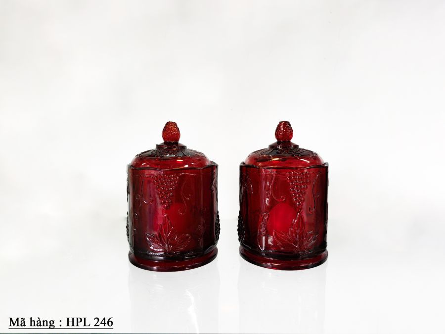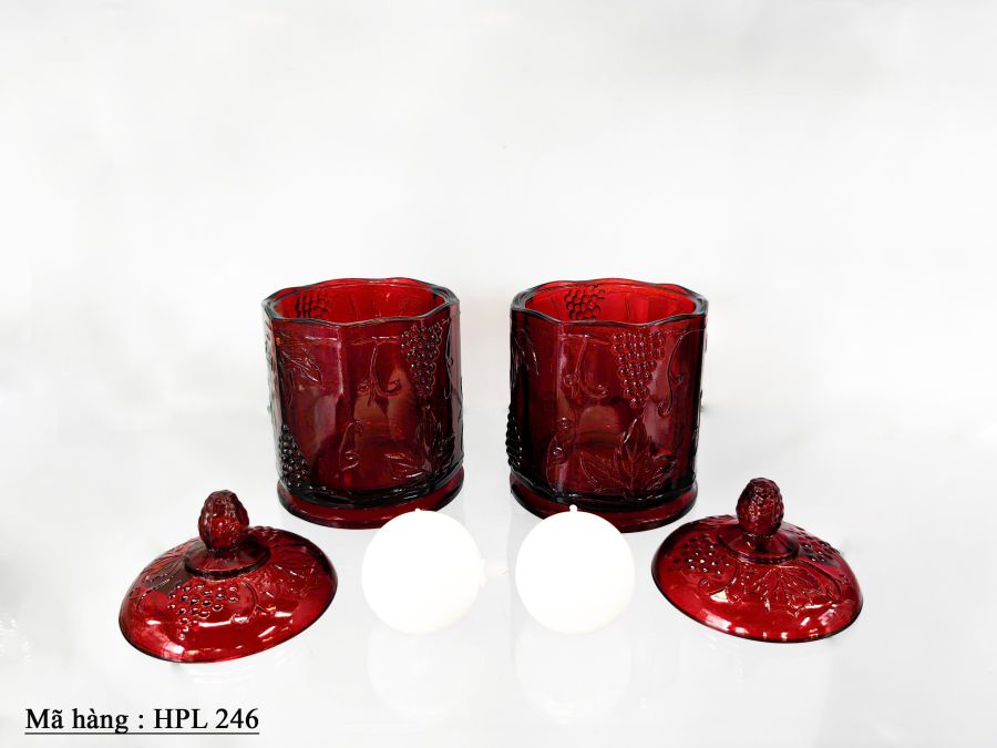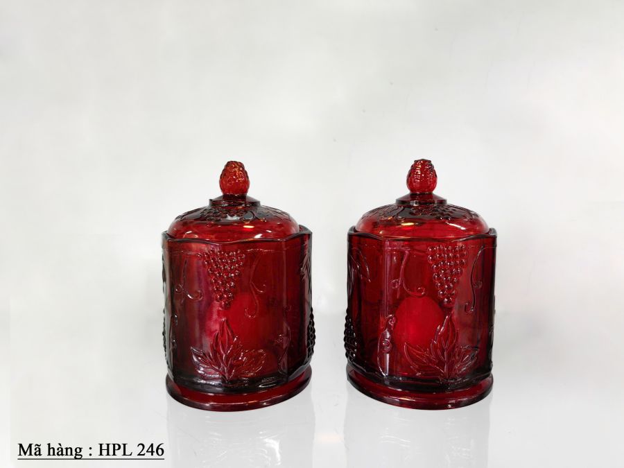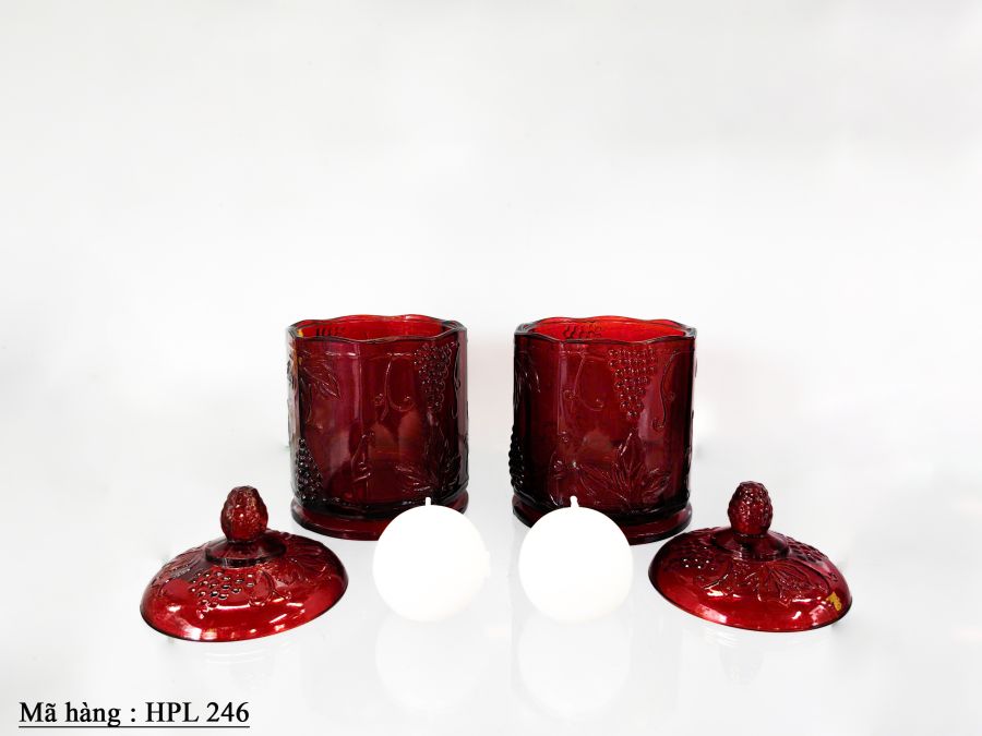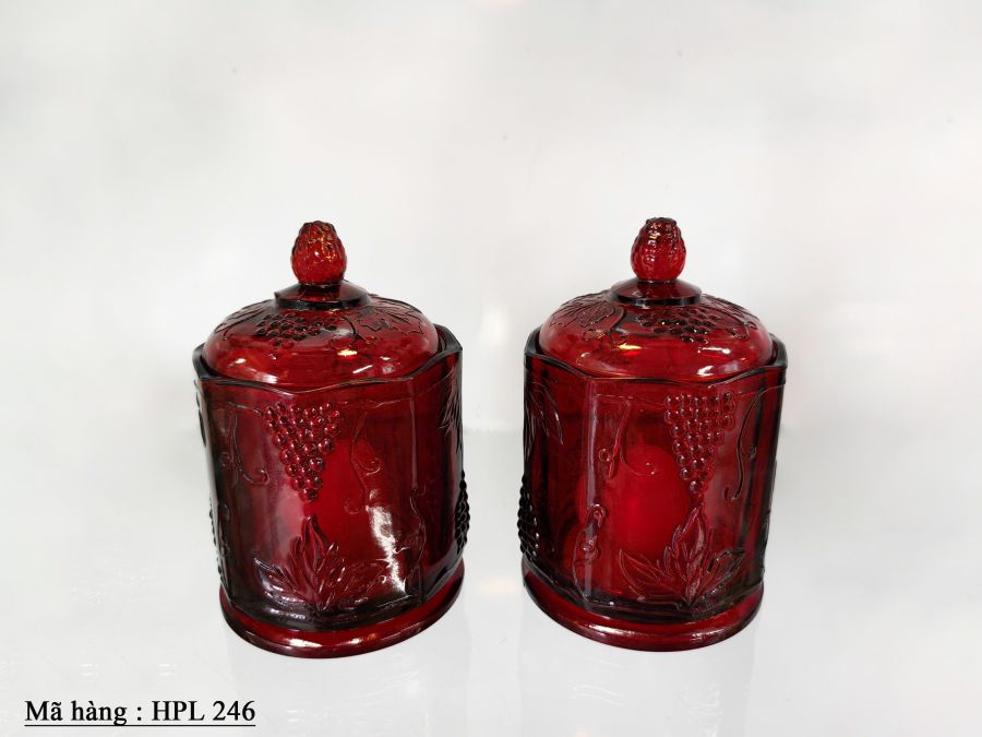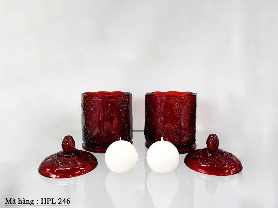 Cặp hủ thủy tinh dùng đựng nến màu đỏ đậm Kích thước : cao 18cm, rộng 11,2cm Trọng lượng : 1,4kg/1 cái Giá : 2.580.000 đ/ cặp SDT liên hệ : 0326059733 Địa chỉ : Trang trí Mỹ Mỹ. 91 Phan Đình Phùng .P1. Đà Lạt.