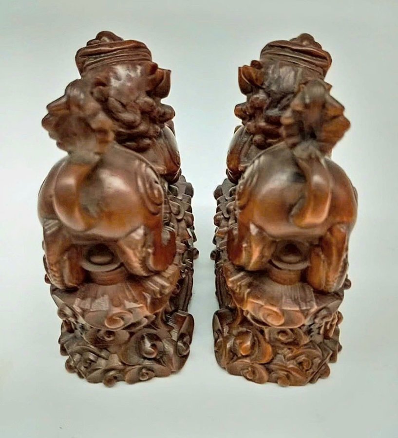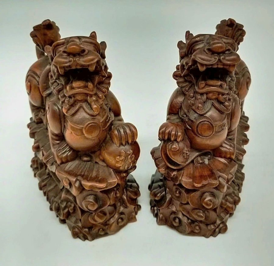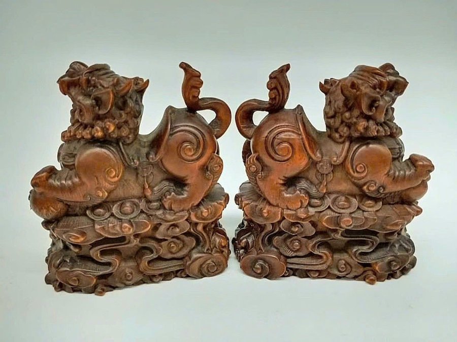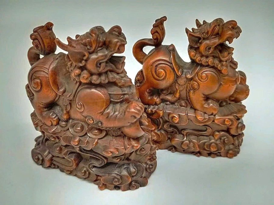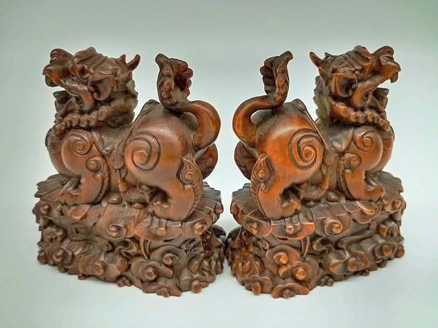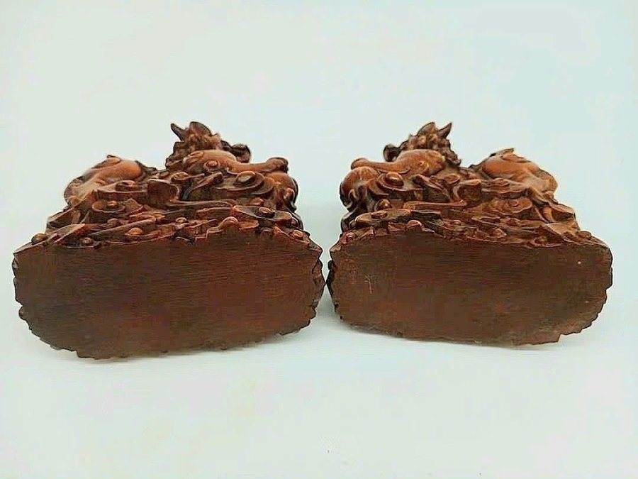 Cặp Kỳ Lân điêu khắc thủ công siêu thực bằng gỗ Hoàng Dương xưa(gỗ tốt phong thủy).Kích thước 8,8cm*7,5cm.