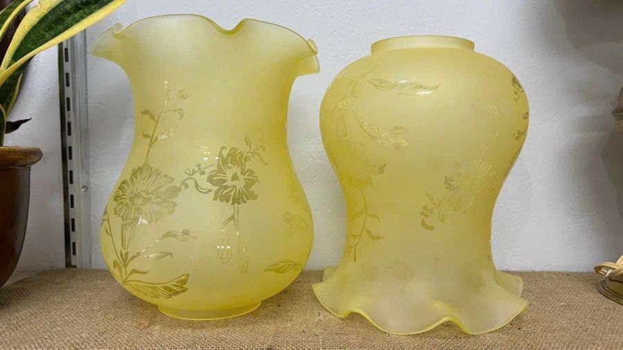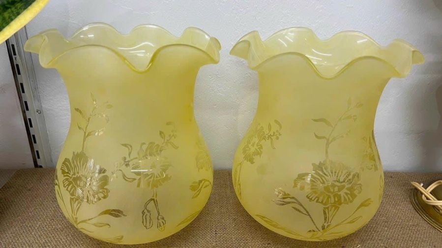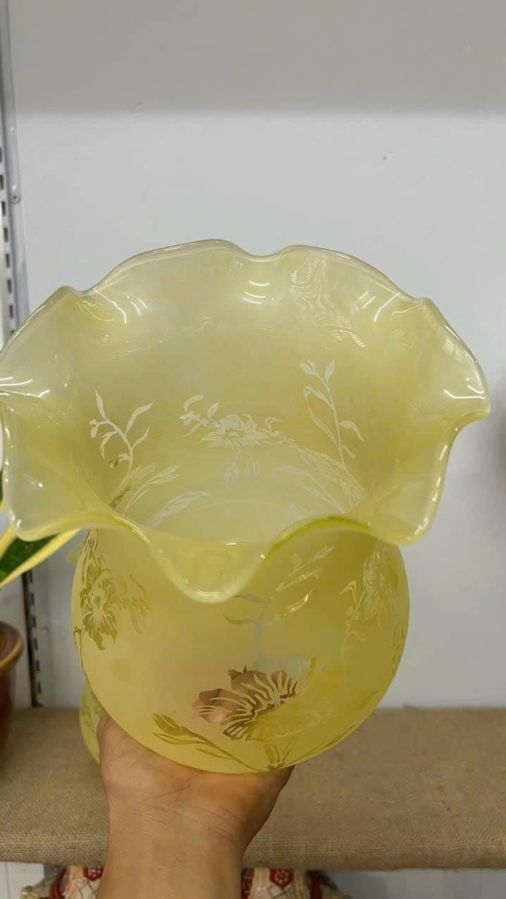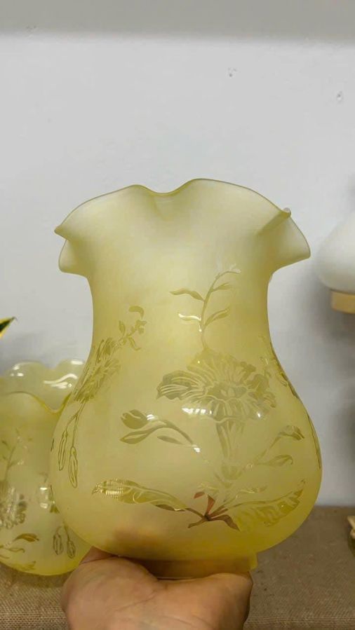 1 cặp lam đèn dầu khắc axit màu vàng chanh tuyệt đẹp nhập châu Âu cho các bác cần lên đèn