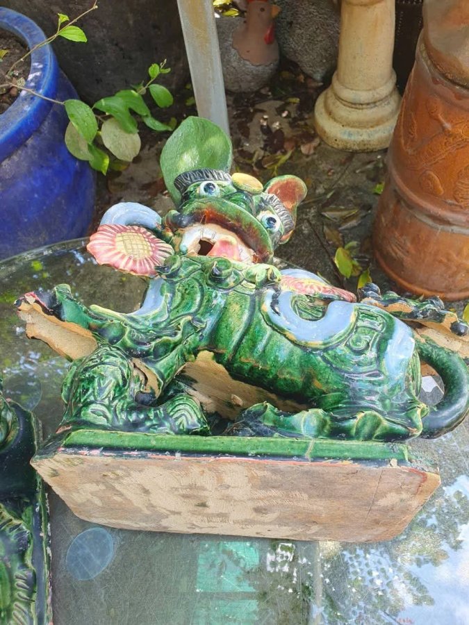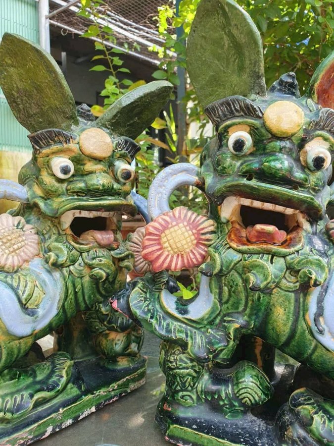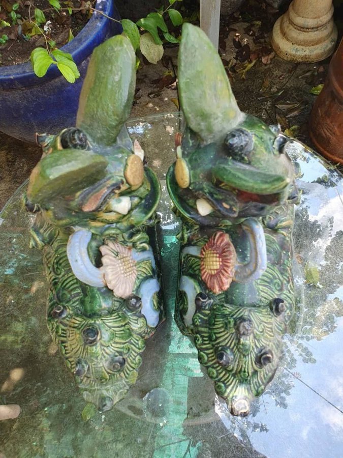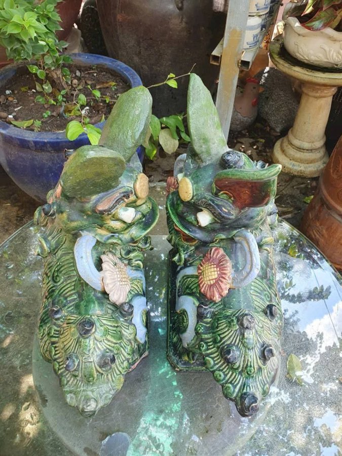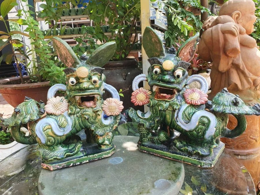 Cặp lân gốm Lái Thiêu xưa.Cao 37cm*36cm*15cm, có thẩm mỹ sửa đôi tai và 1 góc đuôi. 5000k