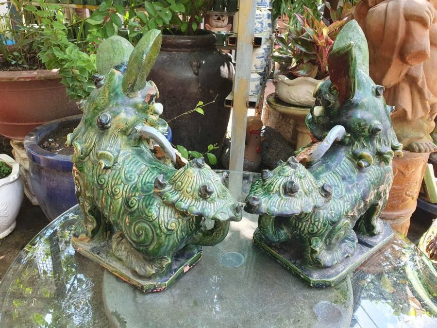 Cặp lân gốm Lái Thiêu xưa.Cao 37cm*36cm*15cm,có thẩm mỹ sửa đôi tai và 1 góc đuôi.