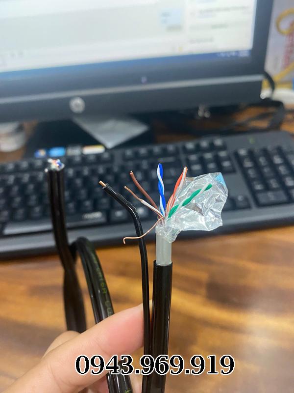 - Thành phần kết cấu cáp mạng ngoài trời FTP còn có thêm 1 sợi dây dù trợ lực ( sợi màu trắng trong ảnh) và 1 sợi dây đồng trần tiếp mát vừa đảm bảo chất lượng, vừa đảm bảo an toàn.