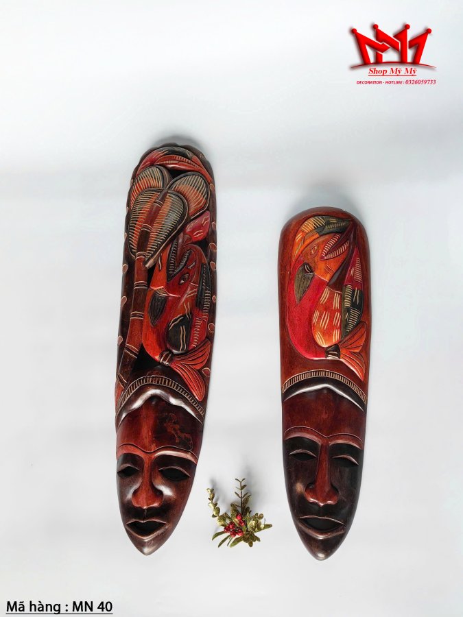 Cặp mặt nạ gỗ trag trí treo tường sơn màu khắc bằng tay của Châu Phi.
