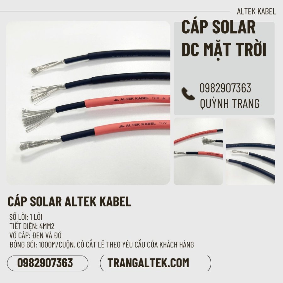 Cáp solar Altek Kabel được sản xuất theo tiêu chuẩn quốc tế, đảm bảo độ bền, chống tia UV và chịu nhiệt tốt. Đây là lựa chọn lý tưởng cho các hệ thống điện mặt trời cần sự ổn định và tuổi thọ lâu dài.