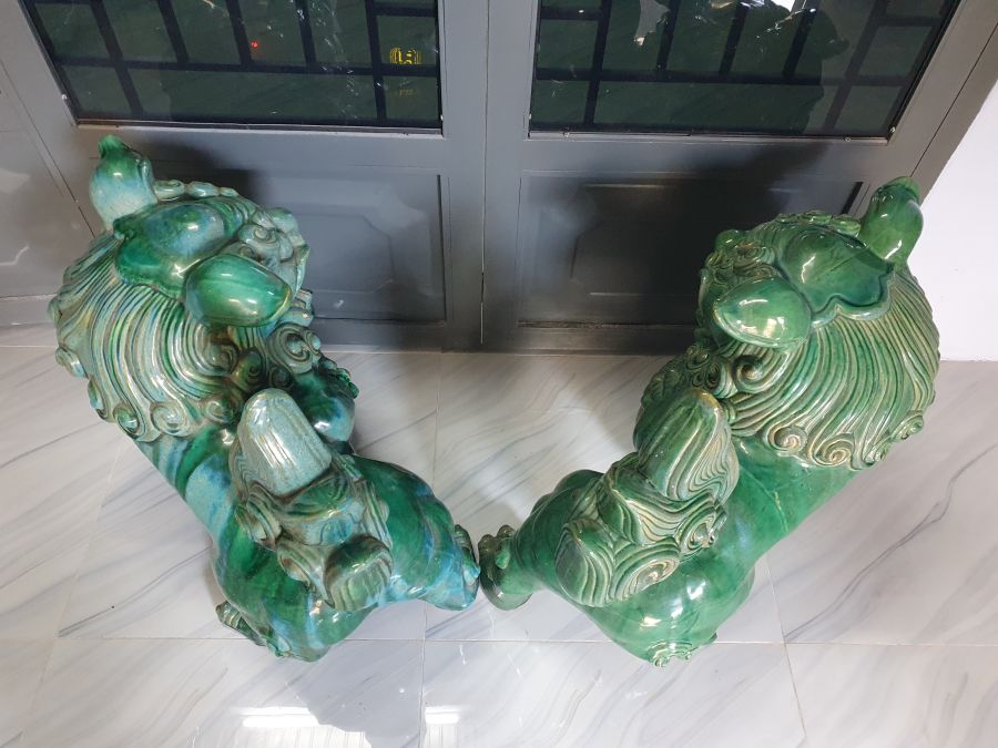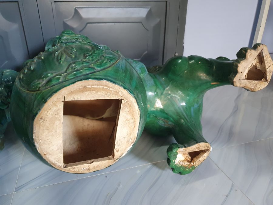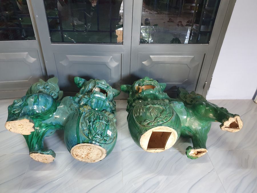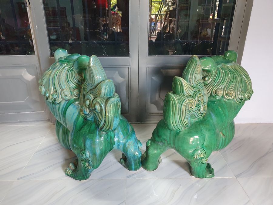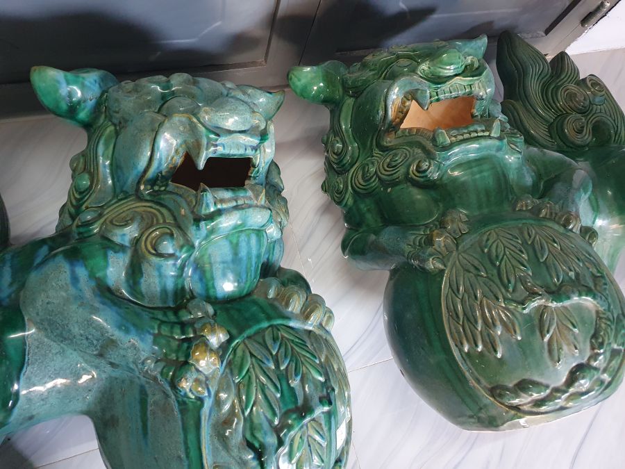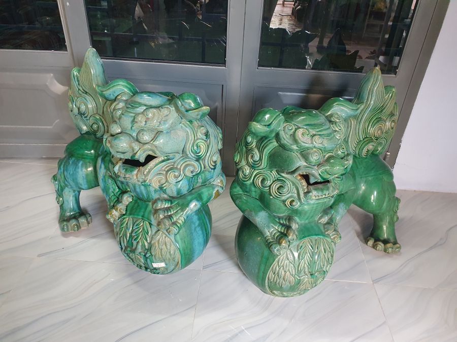 Cặp sư tử vờn cầu gốm Lái Thiêu cũ có nhiều chỗ men hỏa biến.Cao 70cm*dài 70cm.Tt 1 con sửa móng chân sau.