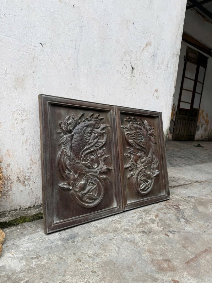 Cặp tranh cá chép hoá rồng Kt : 58 x 38 x 3 Gỗ lim