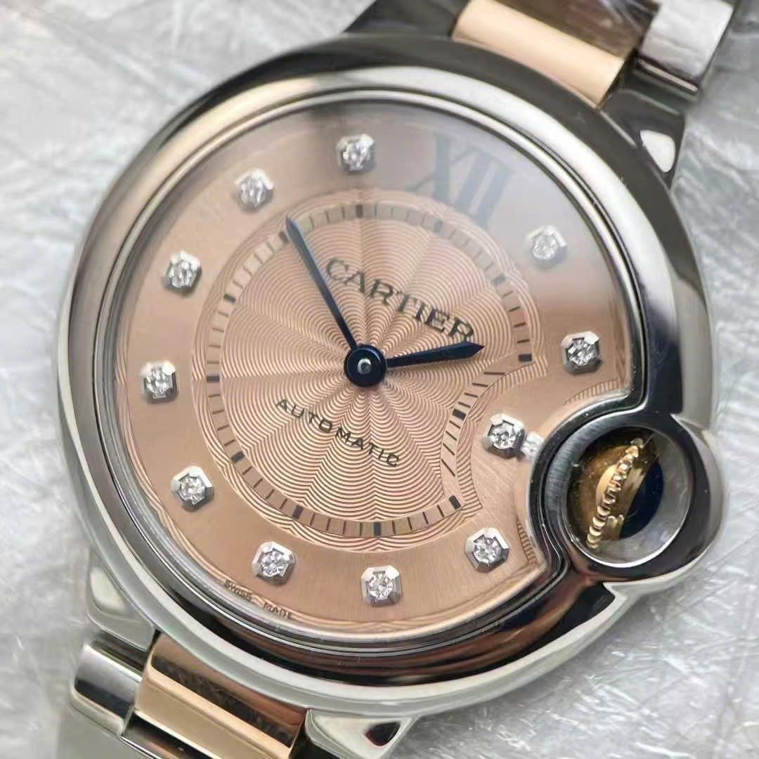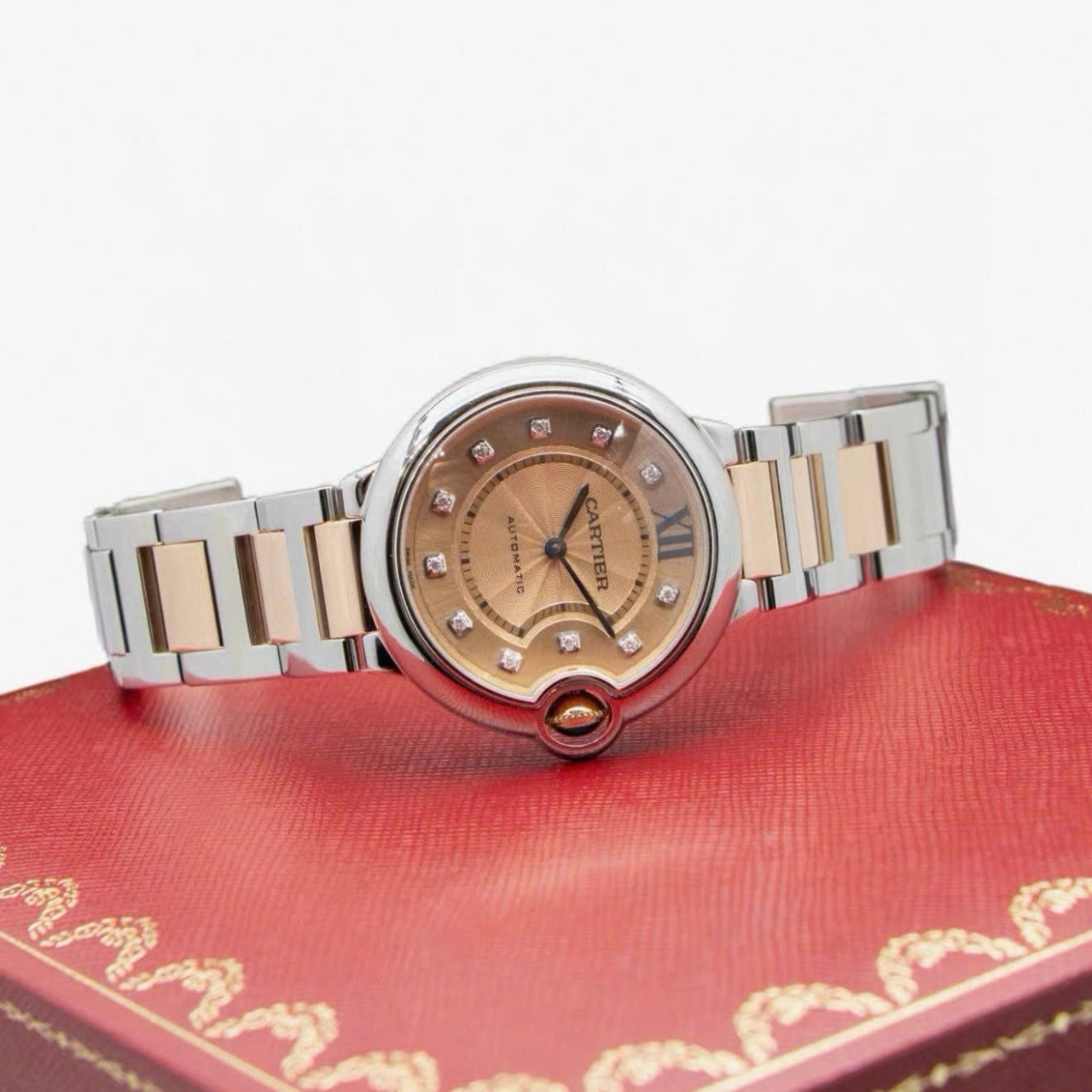 Cartier ballon nữ size 33mmDemi vàng khối 18K. Cọc số kim cương. Mặt vàng hồng cá hồi rất đẹp. Đầy đủ hộp sổ thẻ.Quá rẻ so với giá mới hơn 360tr