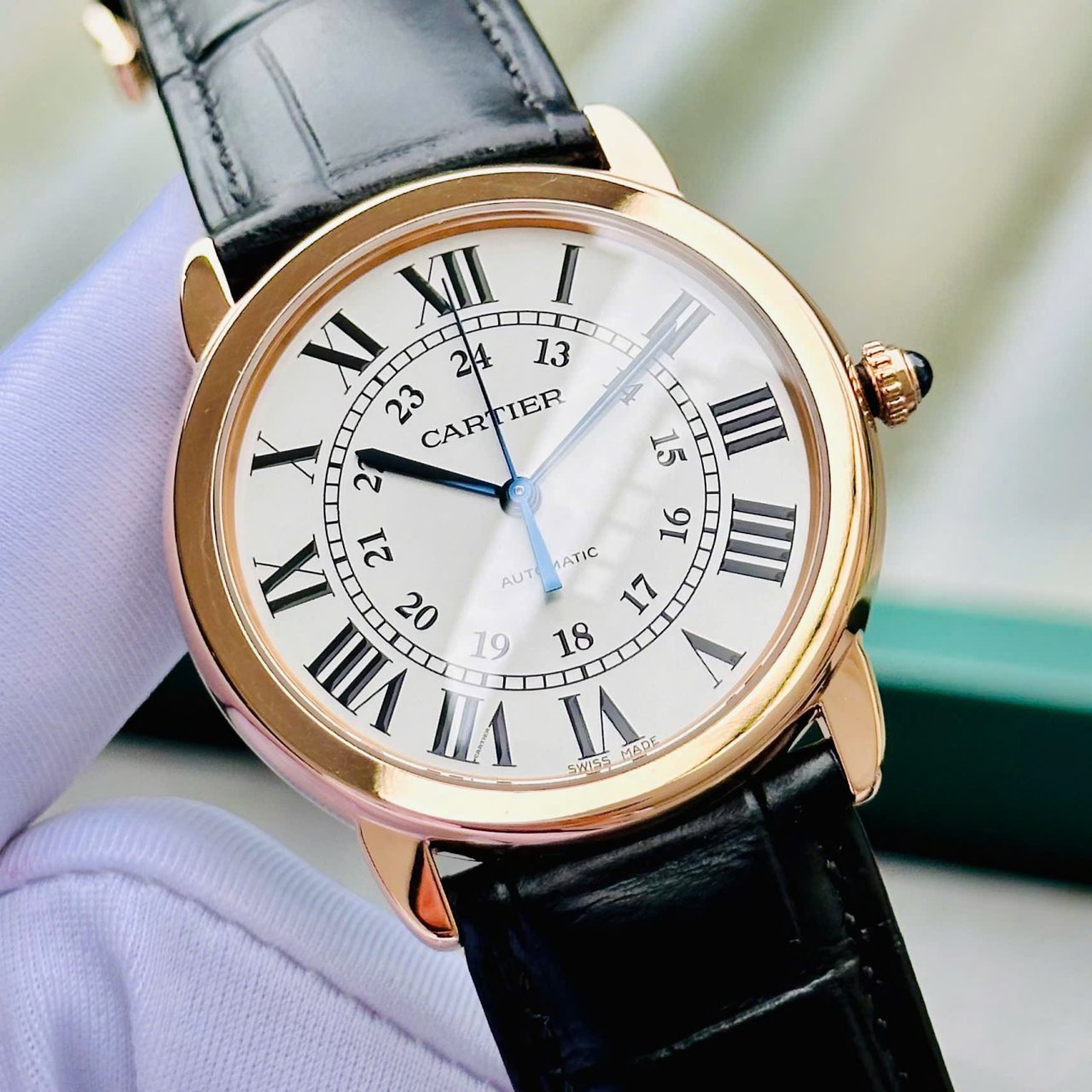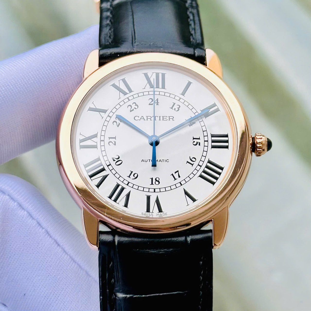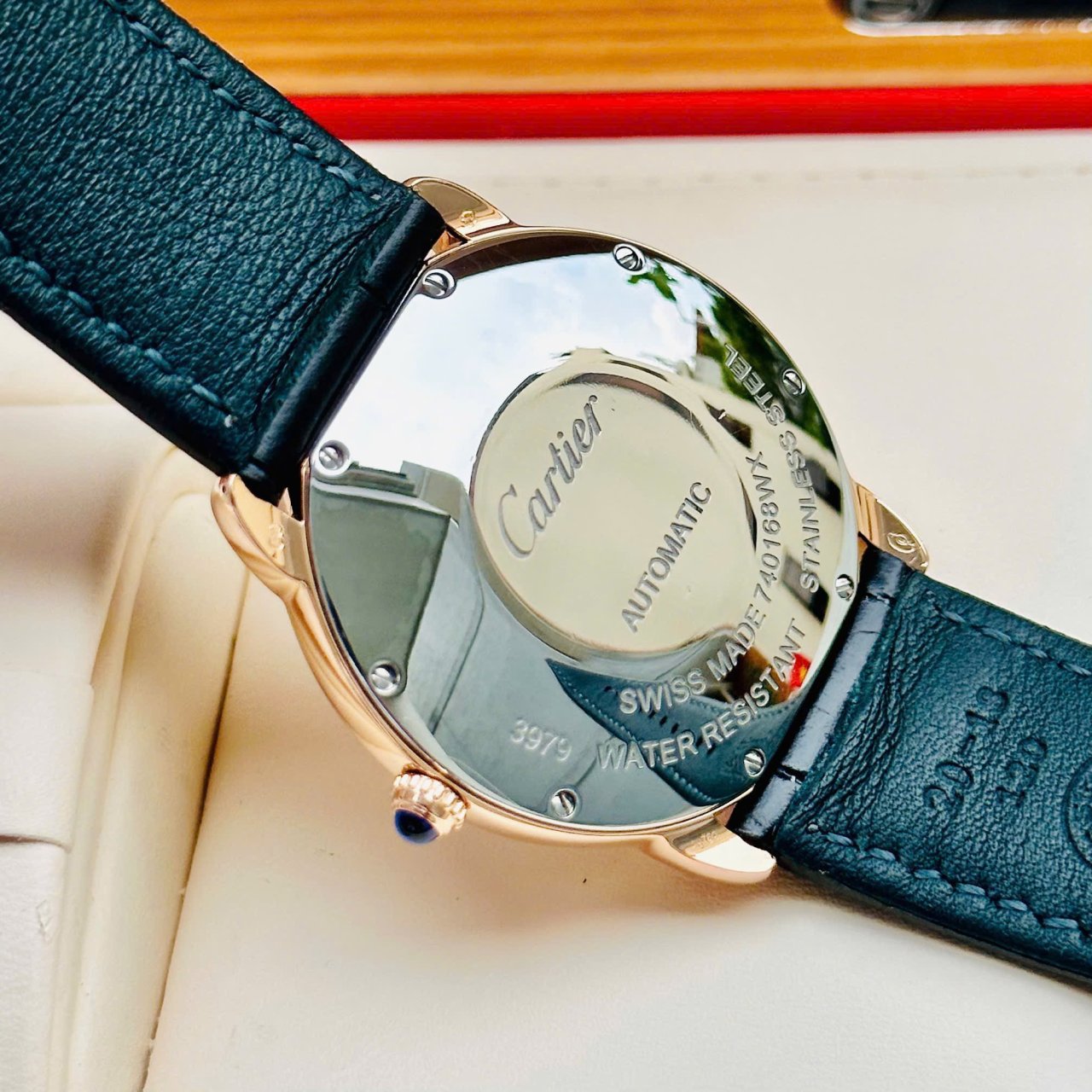 - Núm của đồng hồ được trang bị viên Cabochon xanh đặc trưng của nhà Cartier