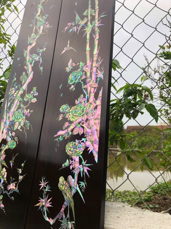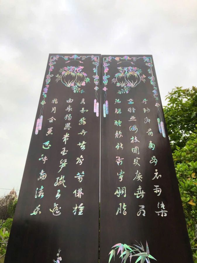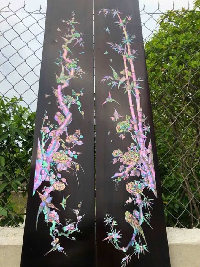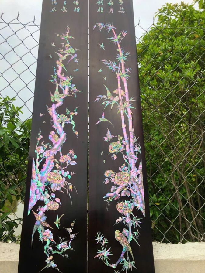 Câu đối gỗ gụ khảm ốc trúc mai Kt 2m37x25x2.6