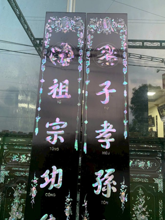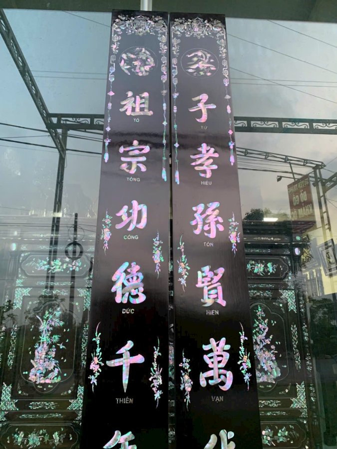 Em giao lưu đôi liền khảm ốc chữ dịch,tổ tông công đức thiên niên thịnh,tử hiểu tôn hiền vạn đại Vĩnh,KT 2m17 x 25cm x3cm ạ,bác nào ưng ý lh em Zalo 0829792418 ạ,e xin cảm ơn