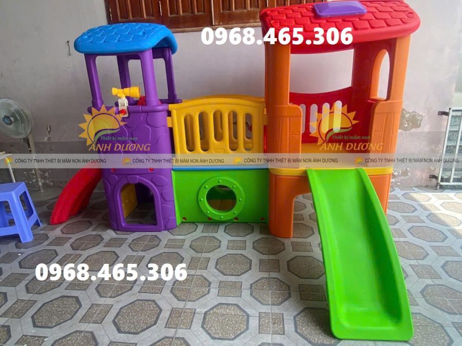 Tầng dưới (màu đỏ) làm đồ chơi đường hầm chui cho bé kiểu đường hầm có cửa sổ hướng ra phía trước. Tầng trên là một lối đi như hành lang với lan can 2 bên nối 2 khối nhà với nhau bằng khớp nối cứng.