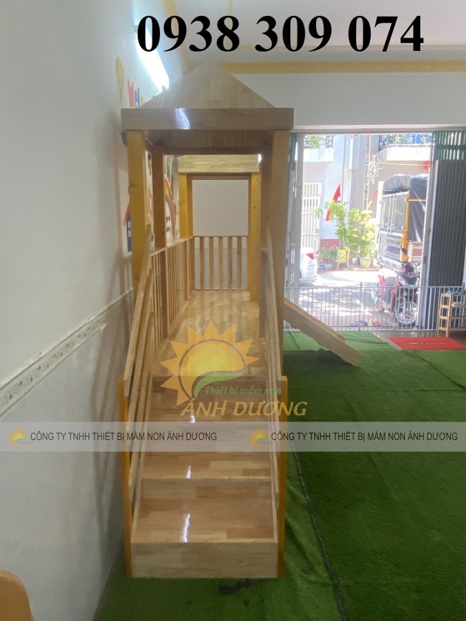Cầu trượt gỗ gồm 2 bộ nhà chòi mái nhà, 1 máng trượt đơn gỗ, 1 cầu thang gỗ cho bé đi lên nhà