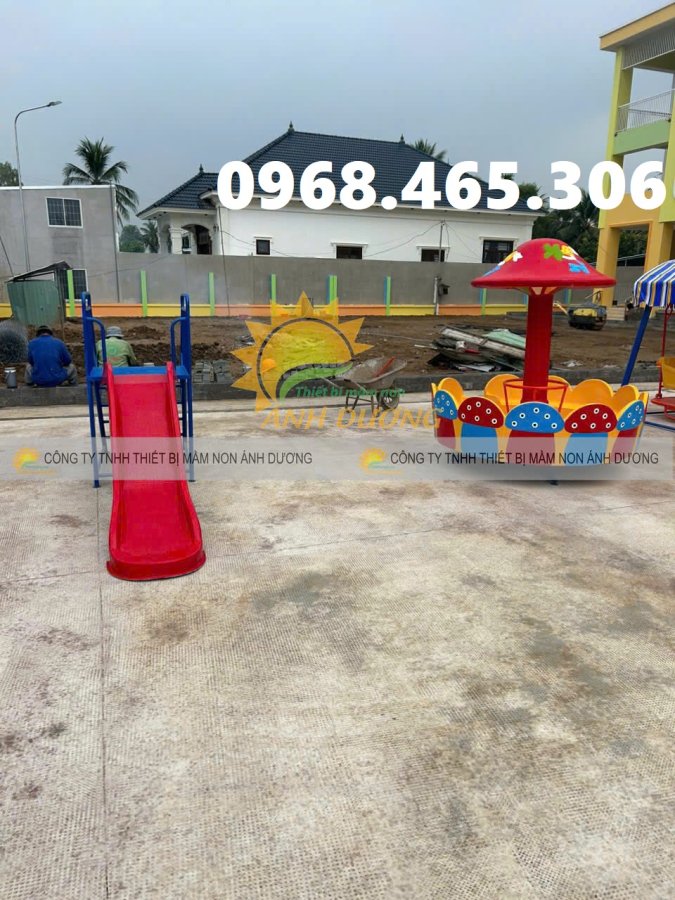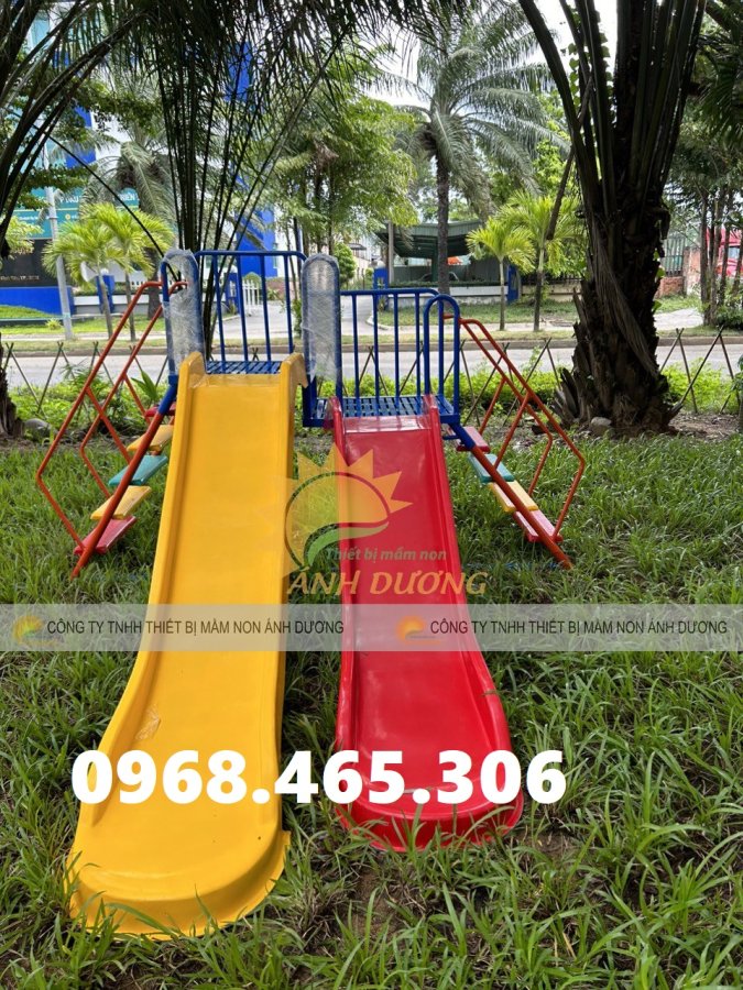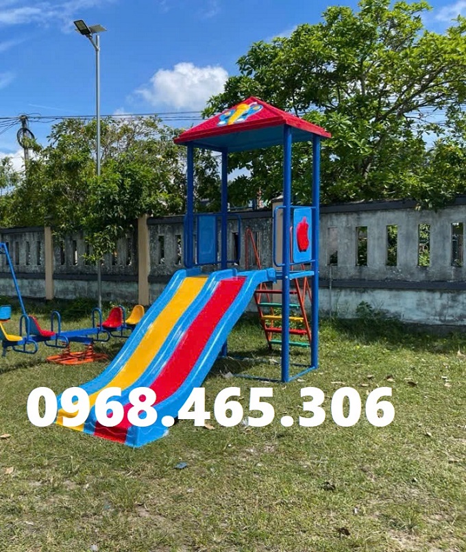 Chất liệu: Máng trượt bằng nhựa LLDPE nguyên sinh chuyên dụng ngoài trời, khung cầu trượt sắt ống Φ76 mm dày 1.5 mm sơn tĩnh điện chống sét.