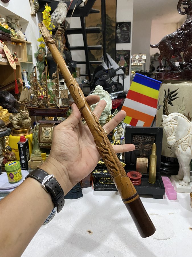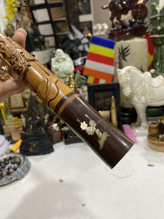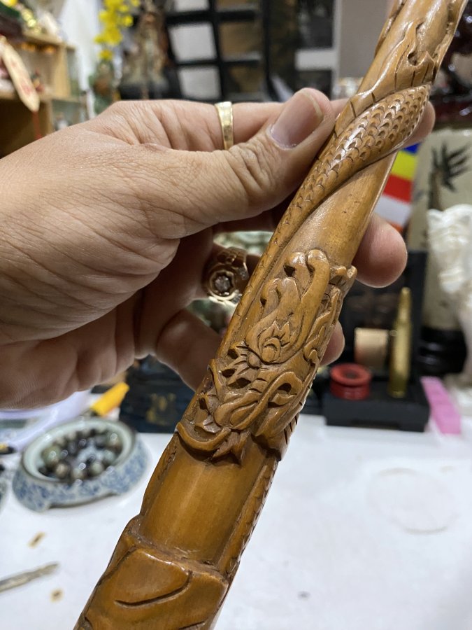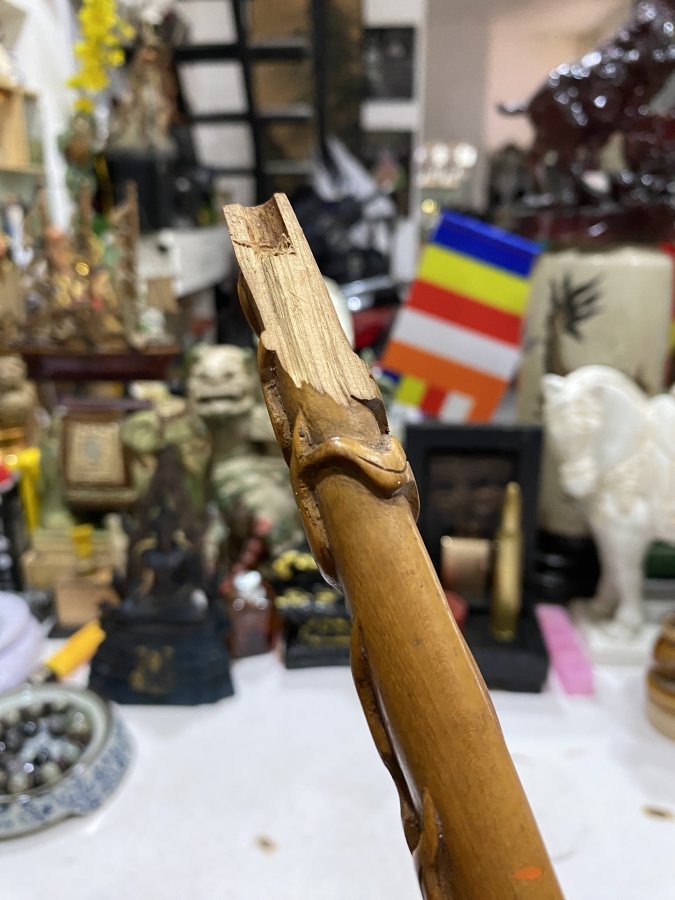 - Trên Thân Gậy Chạm Long Vân , Tình Trạng Mẻ Một Bên Bề Mặt Trơn ( Về Anh Em Tự Gia Cố Phần Mũi , Bọc Đồng )