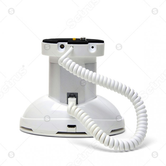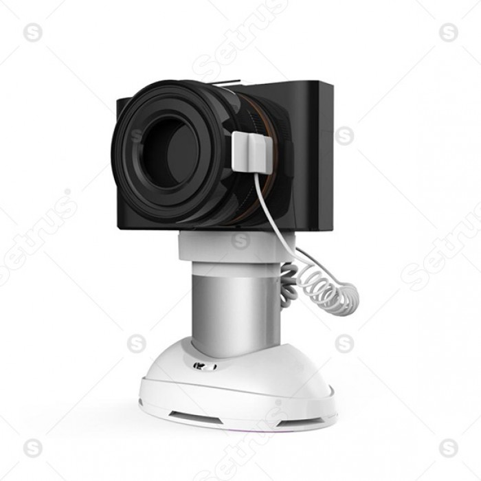 Sản phẩm máy ảnh, camera khi trưng bày sẽ được cố định bằng ốc vít chuyên dụng và gắn vào một bệ đỡ được tích hợp sẳn 1 lớp đệm giúp chống trầy tại vị trí trên cùng của chân đế. Phần bệ đỡ này được thiết kế để cố định với phần thân của chân đế bằng từ tính, chỉ với một thao tác đơn giản là nhấc sản phẩm trưng bày lên là khách hàng đã có thể thoải mái trải nghiệm mọi tính năng của sản phẩm một cách dễ dàng. Kết hợp cùng remote điều khiển mở/tắt thiết bị an toàn.