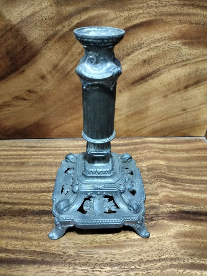Chân đèn xưa antimon họa tiết hoa văn cổ điển điển. Kích thước : Cao 24cm, đế 13cm x 13cm.