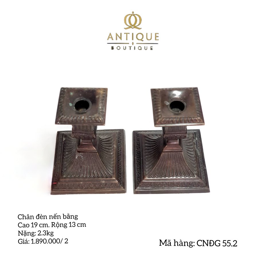 Cặp chân nến trong hình có dáng vẻ cổ điển và trang nhã. Với đế vuông và màu nâu. Chân nến cao 19 cm, rộng 13 cm.