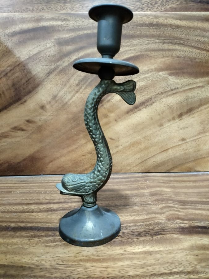 Chân nến cá hóa long bắng đồng nguyên khối. Cao 23,5cm, đường kính chân đế 7cm, đế tháo lắp được.