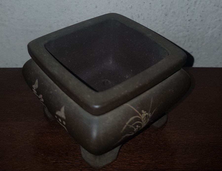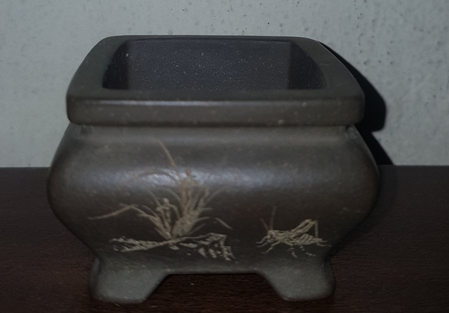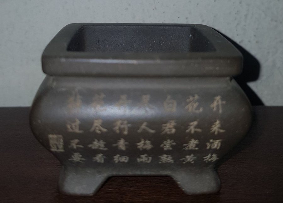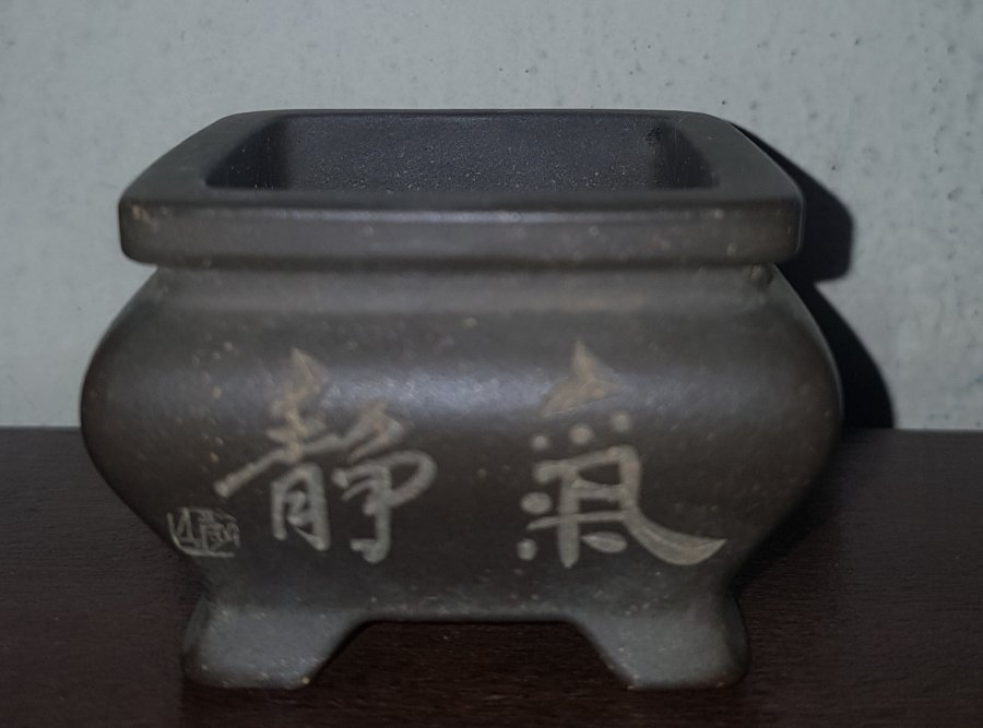 Chậu bon sai siêu mini chất liệu tử sa điêu khắc bằng tay hoa tiết và thư pháp như hình chụp. kích thước cao 4.5cm. phủ bì 5x5cm. lọt lòng 4x4cm. lành lặn GL680k