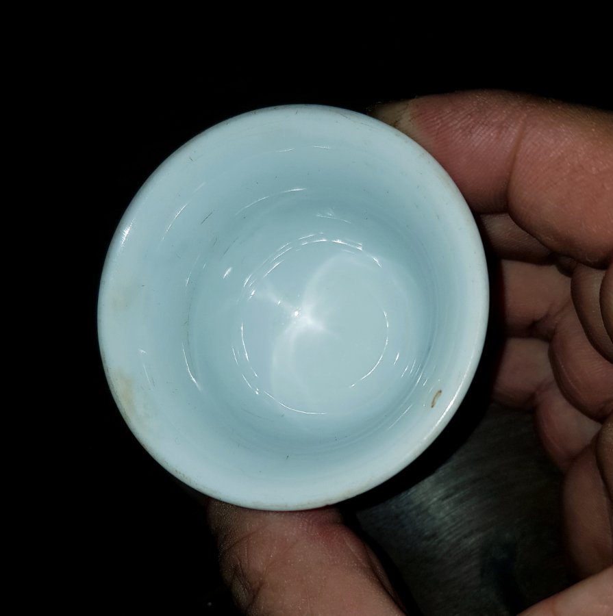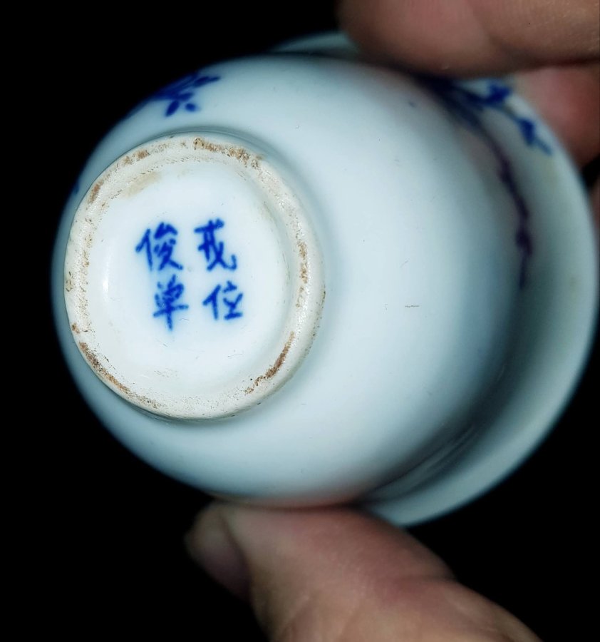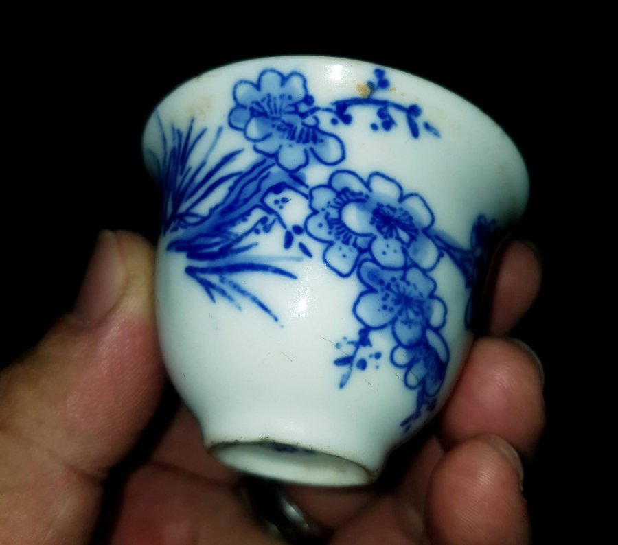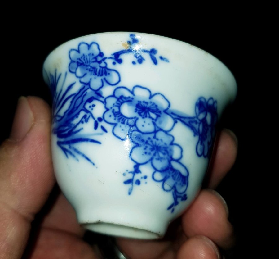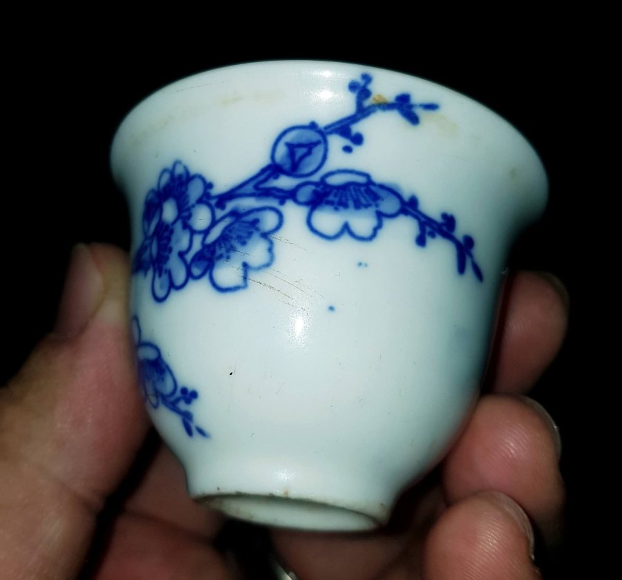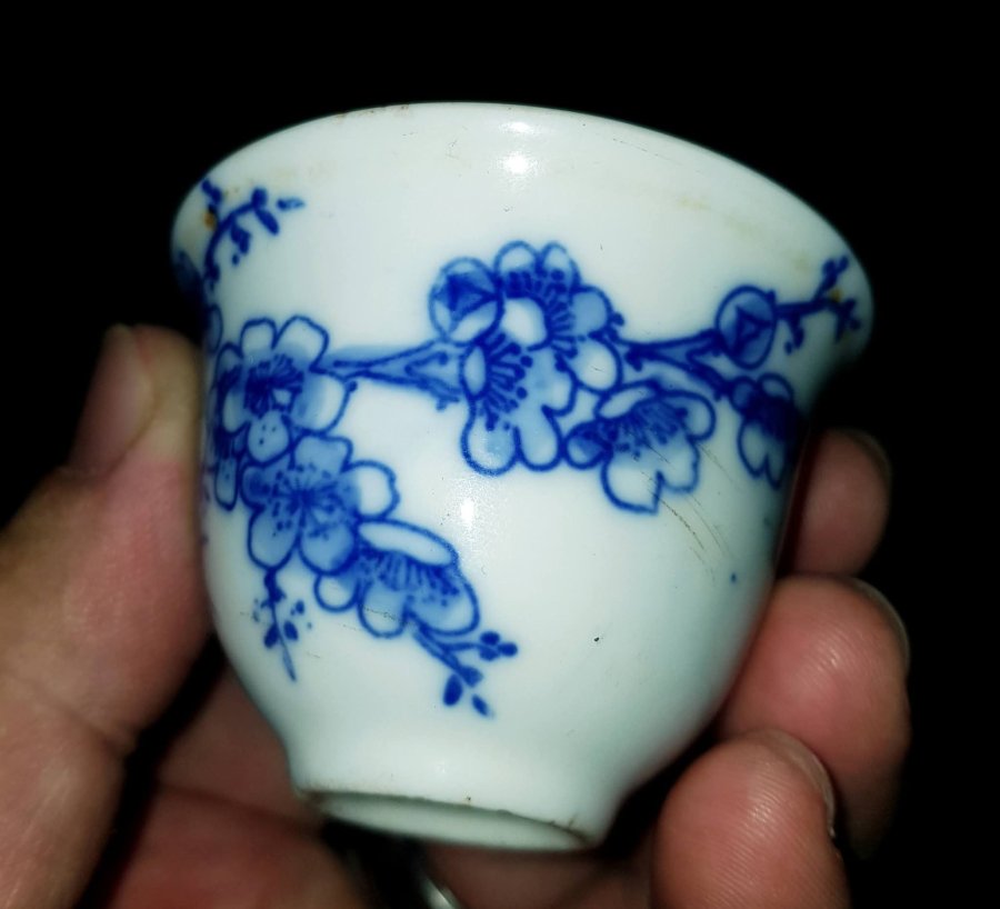 Chén sứ men lam chàm hồi chuẩn cổ họa pháp cội mai già nghênh xuân. Chén có đường kính 6cm. cao 4.5cm. lành lặn. GL950k