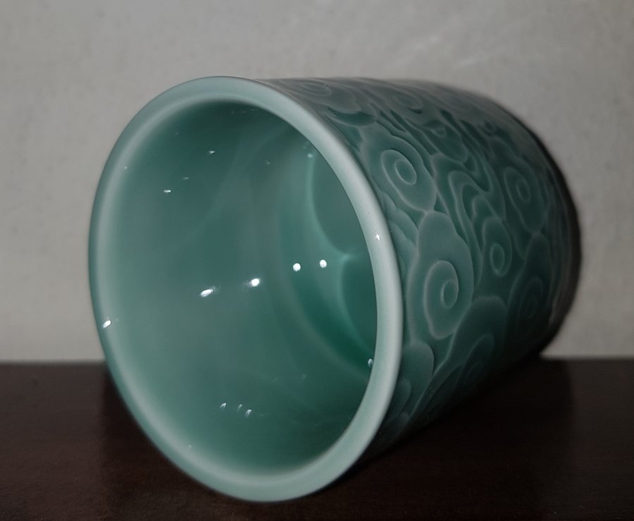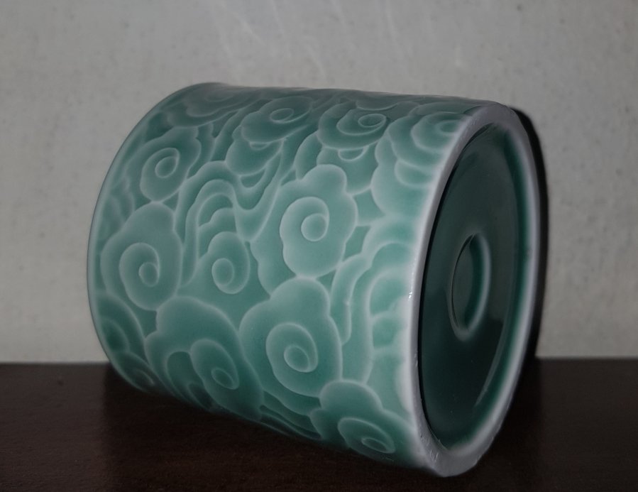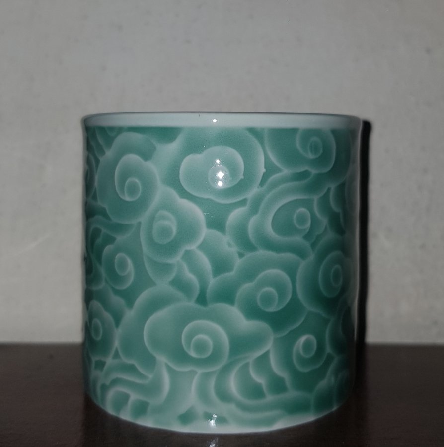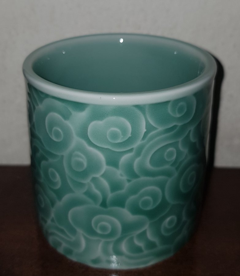 Chén sứ Long Tuyền men ngọc trứ danh thiên hạ , ám họa tản vân hình gậy Như Ý. Chén có đường kính miệng 6.5cm.cao 6cm. lành lặn. GL295k