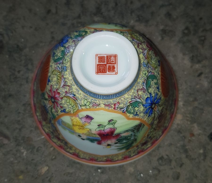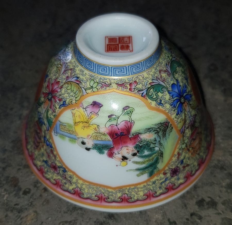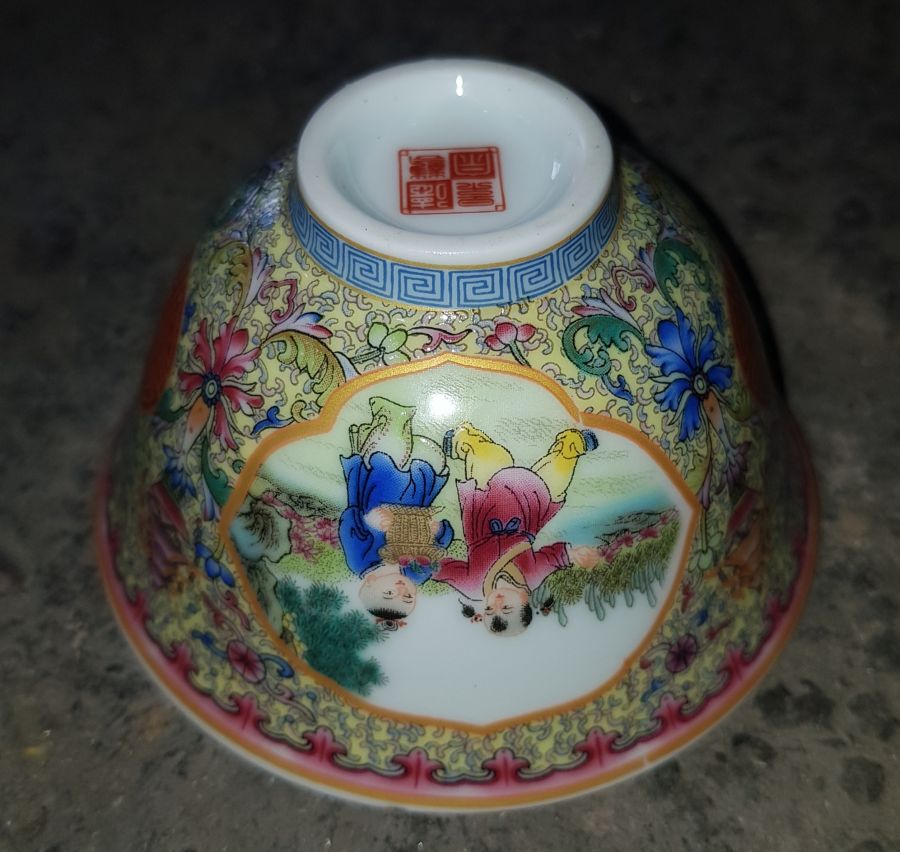 Chén sứ dáng chuông men gấm bổ ô họa pháp nhân vật có trong lòng là men hồ thủy. chén miệng 8.6cm. cao 5.5cm. lành lặn. GL485k
