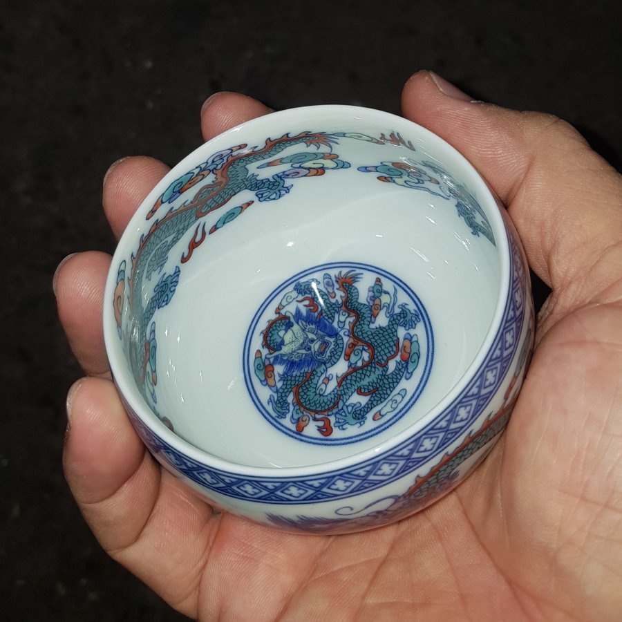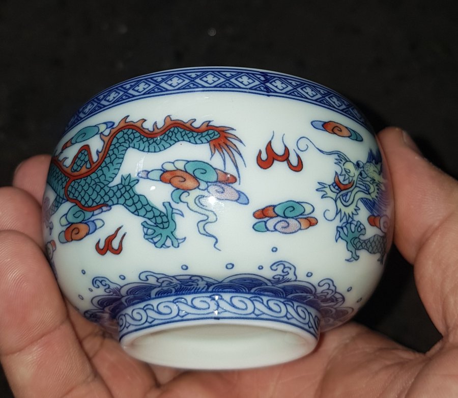 Chén sứ vẽ ngũ long men ngũ sắc sứ Thanh Hoa chất sứ mỏng nước men đẹp như ngọc bích có đường kính miệng 7.5cm. cao 5.5cm. lành lặn. GL385k