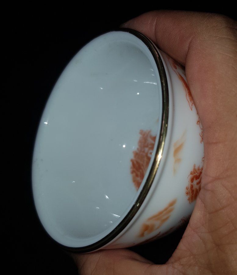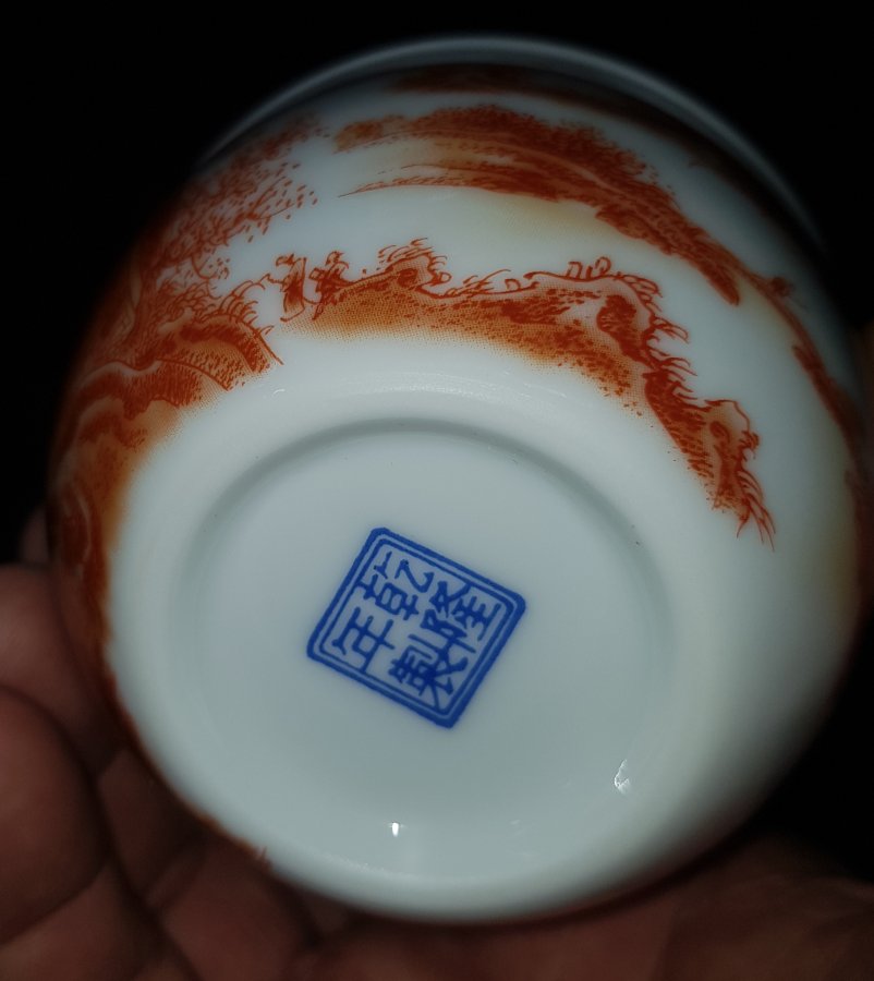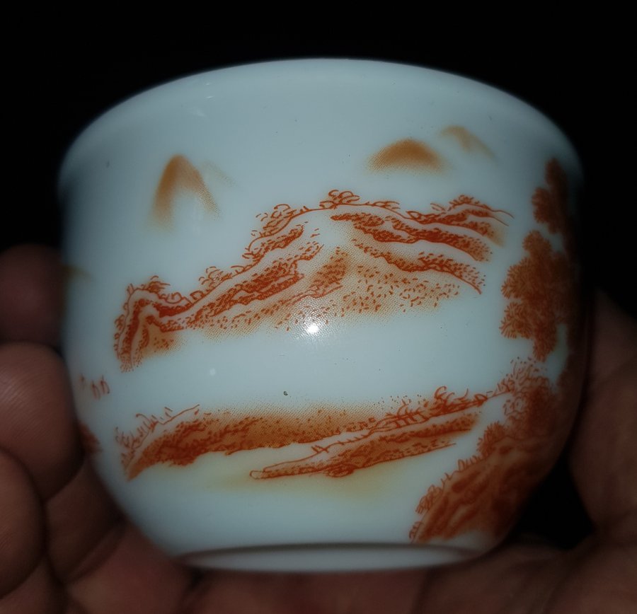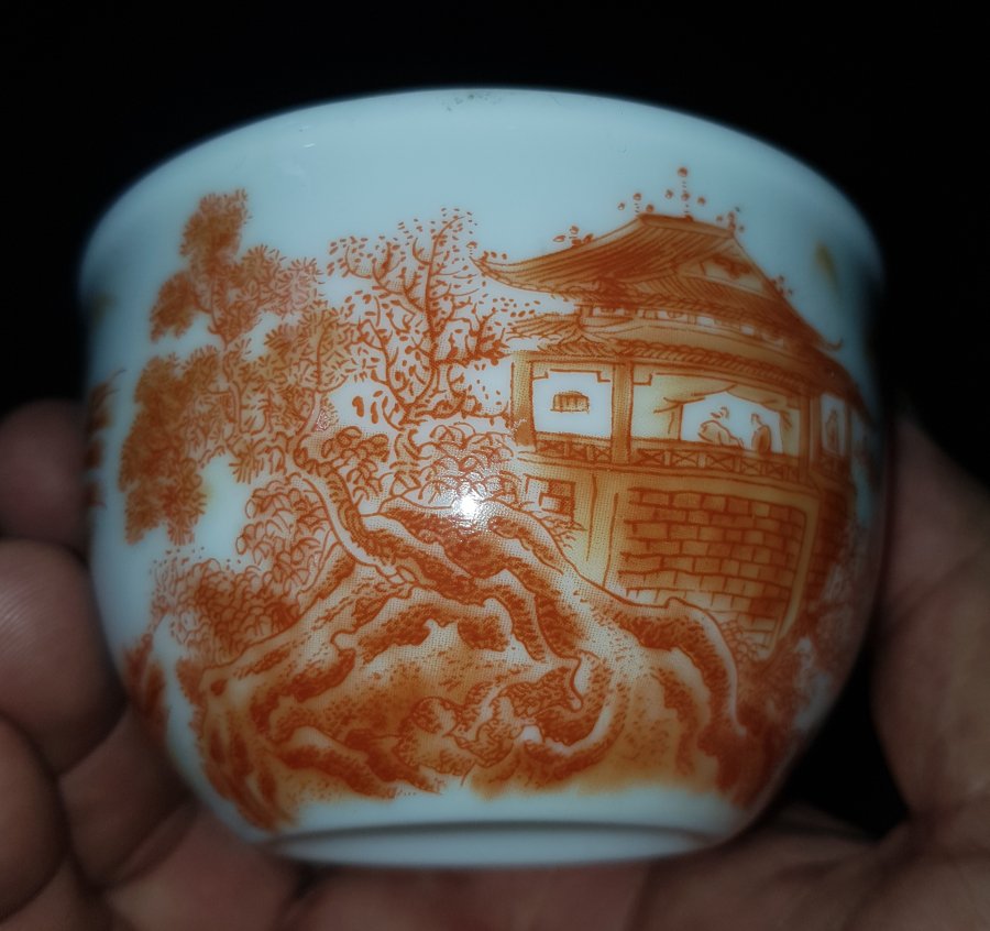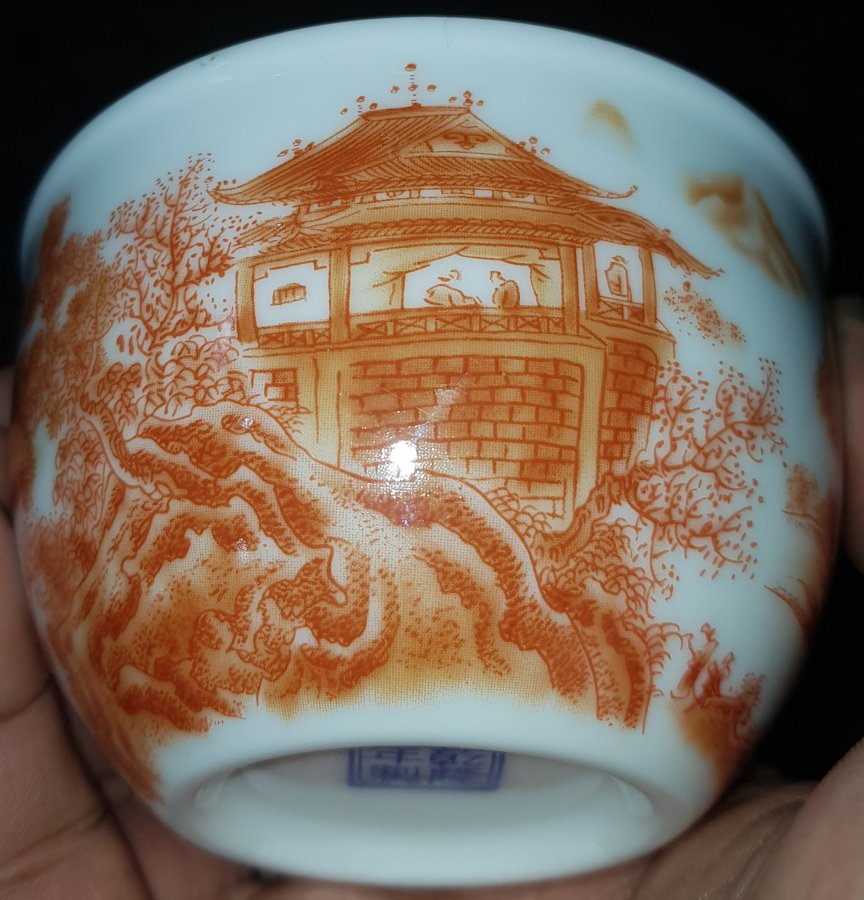 Chén trà sứ nhị tiên đối ẩm trên lầu với nét họa pháp cuốn hút. chén có miệng 8.6cm. cao 5.5cm. GL385k