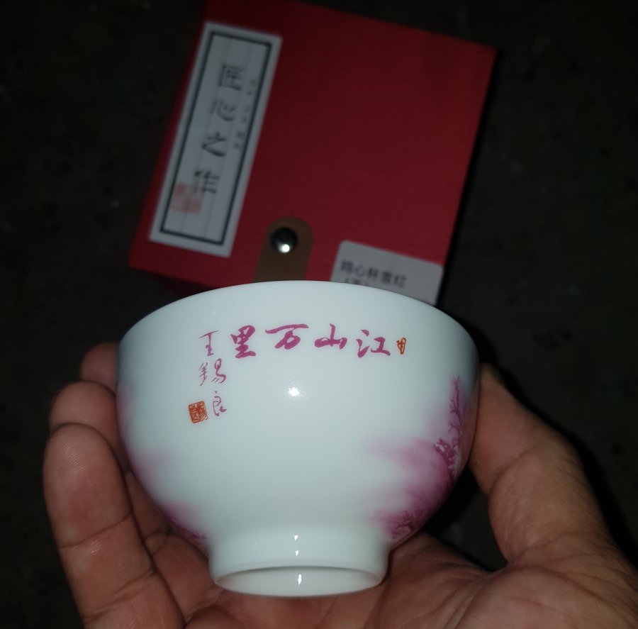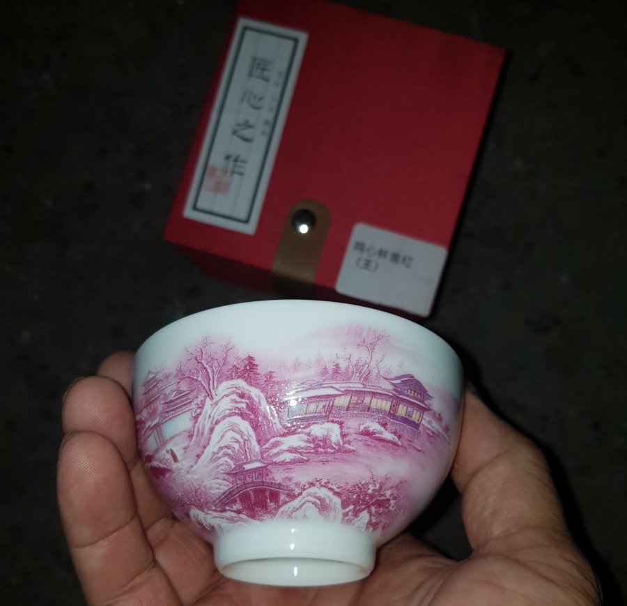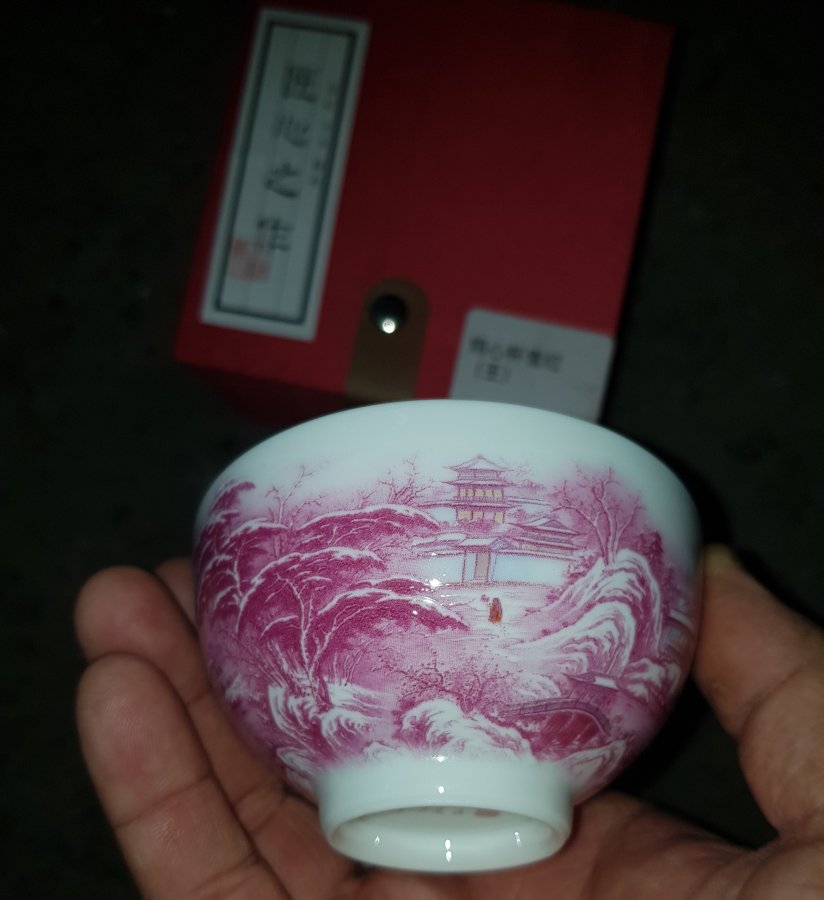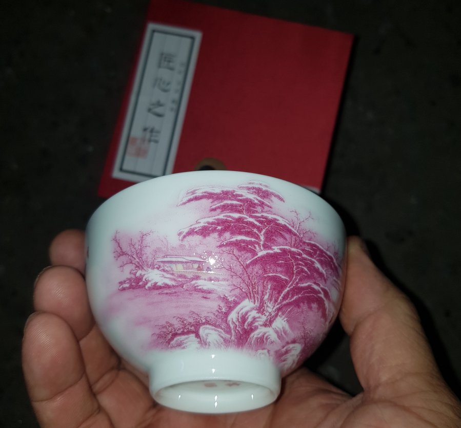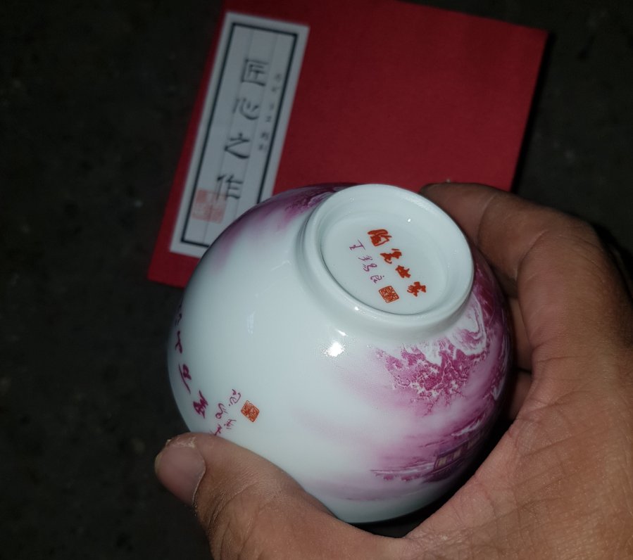 Hiện vật là 1 chiếc chén sứ Thanh Hoa được tạo ra từ chàm men mã não khắc họa cảnh sinh động. có hộp đựng làm tăng lên sự quý phái cho tác phẩm. Đường kính 8.5cm.cao 5cm. GL970k